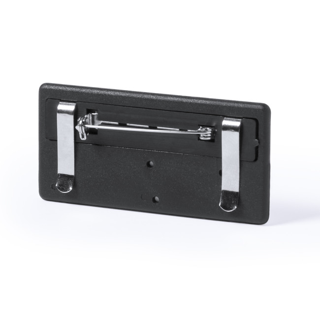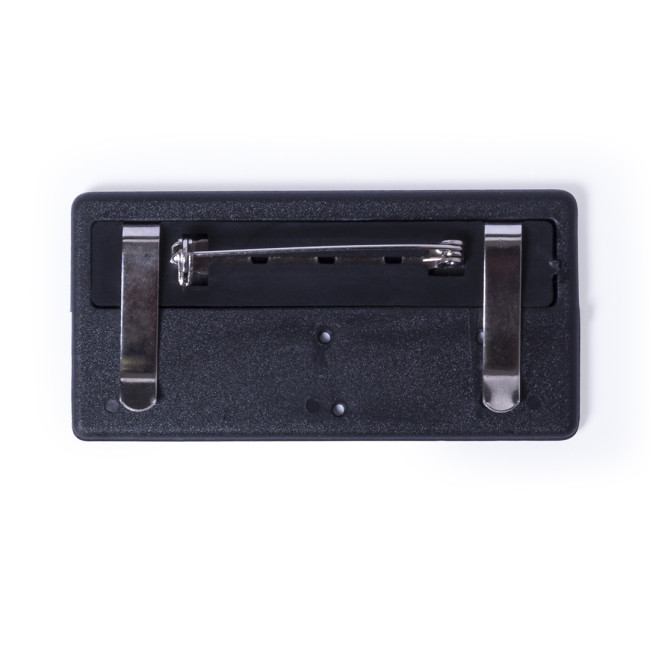 Badge portanome con finitura lucida. Dorso con doppio sistema di chiusura - clip metallica e spilla di sicurezza - per una vestibilità sicura.