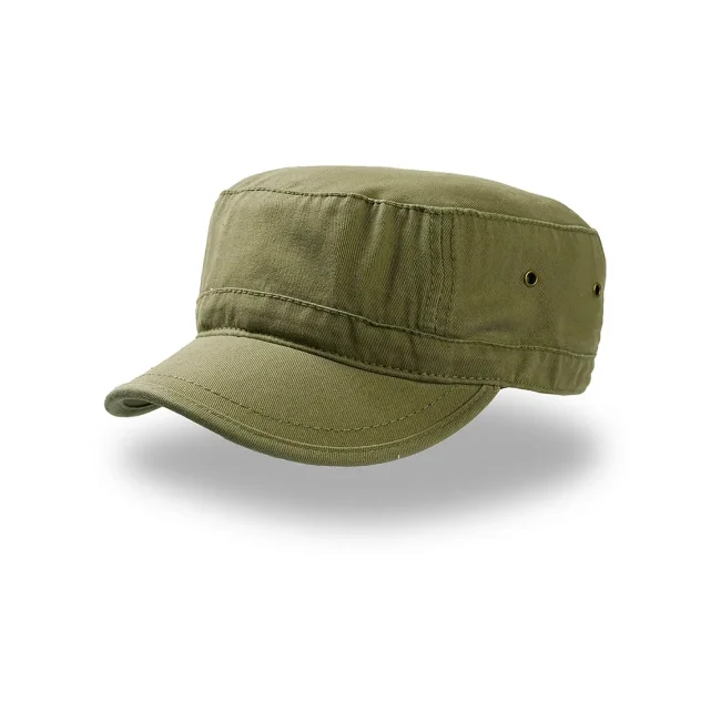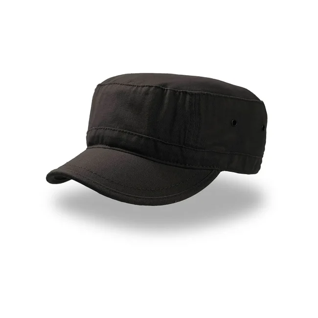 100% cotone. Cappello stile militare, occhielli in metallo, pannello frontale non strutturato, visiera pre-curvata, completamente chiuso, chiusura con fibbia in metallo, 1 cucitura su visiera parasudore in cotone, fettuccia su visiera, etichetta removibile.