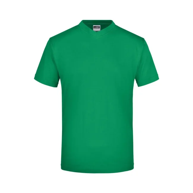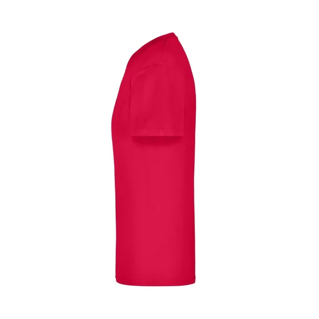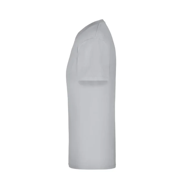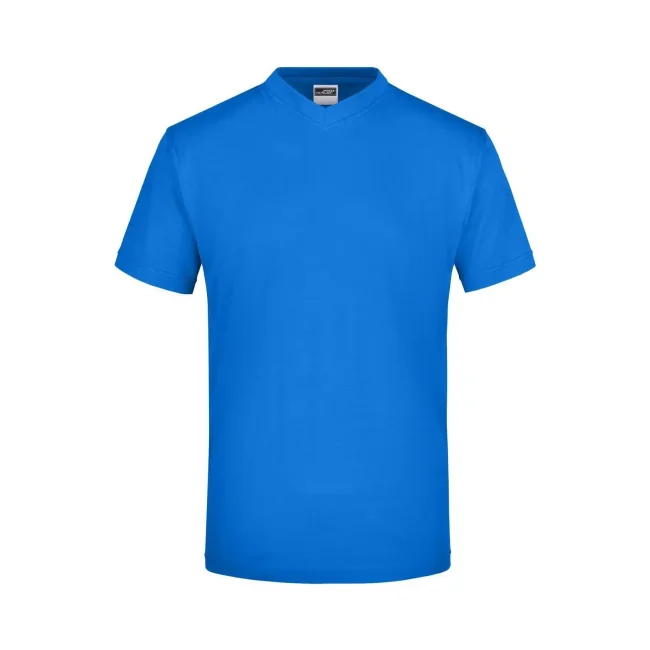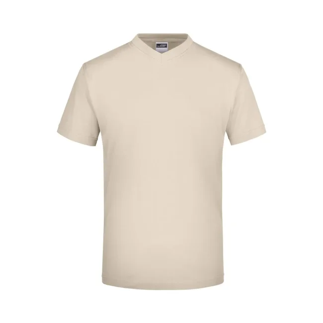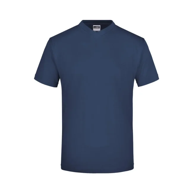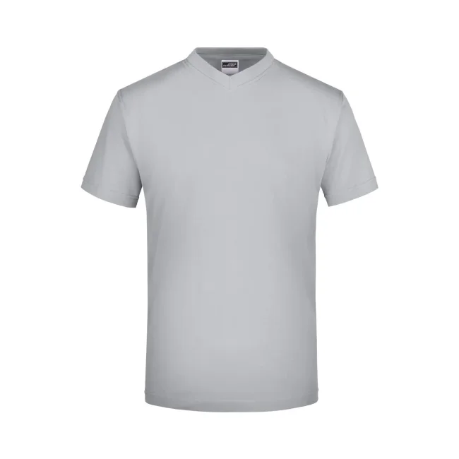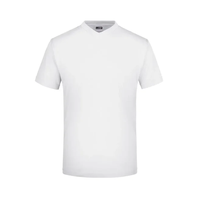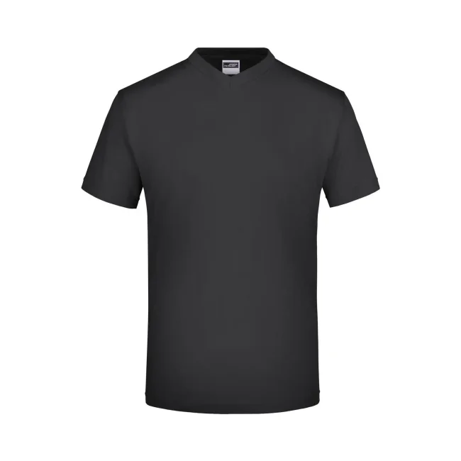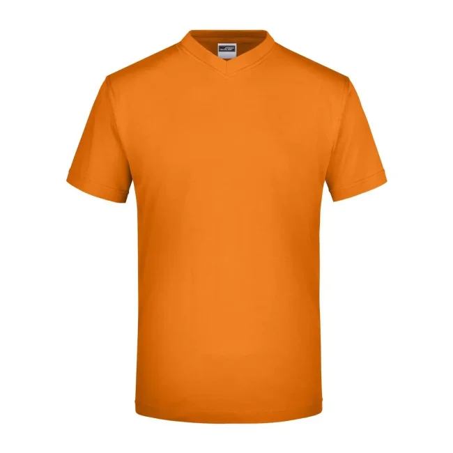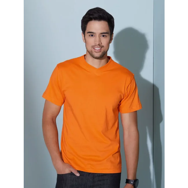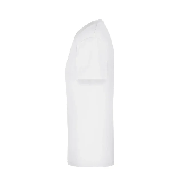 100% cotone. T-shirt comfort in single jersey, Collo a V con elastan. Senza cuciture laterali, necktape. Cuciture doppie sulle spalle, sullo scollo e sul giromanica. Tessuto esterno (150 g/m²). Manica corta, senza cuciture laterali.