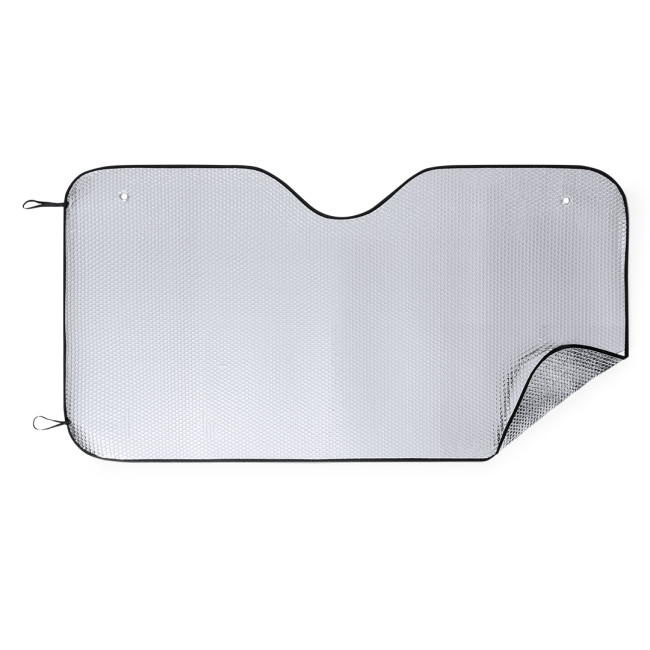 Parasole in alluminio con bolla su entrambi i lati in colore argento con finitura metallizzata e bordi neri. Formato maxi 143x74cm, con anelli di rinforzo in metallo, cinghie elastiche per la piegatura, due ventose per l'adattamento nel lunotto e inviato steso per una facile stampa.