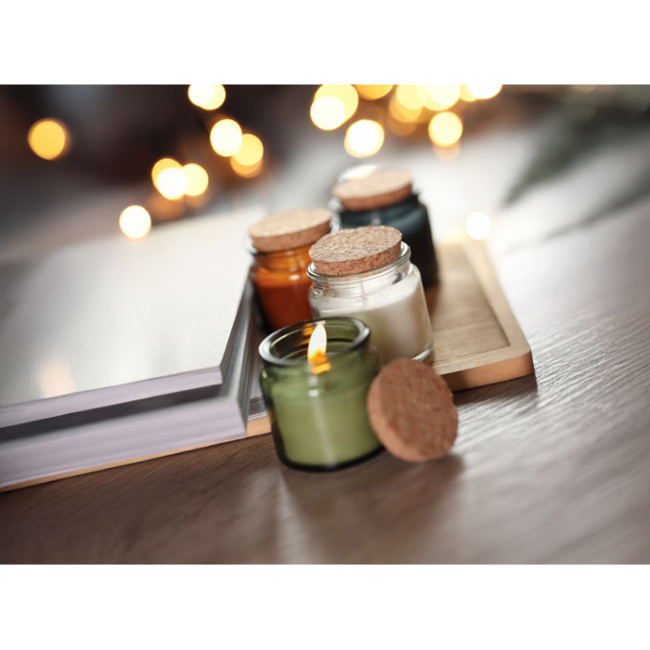 Candela in cera a base vegetale profumata alla vaniglia, in contenitore di vetro con coperchio in sughero. 70 gr. Tempo di combustione 12 ore
