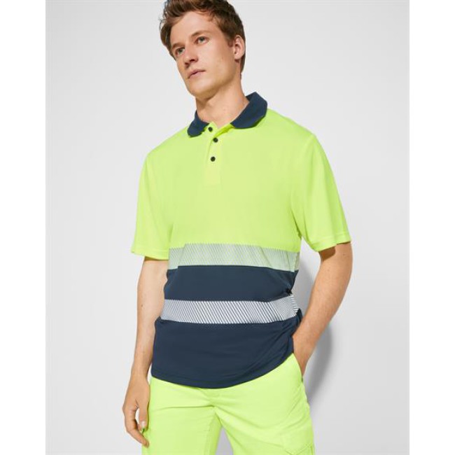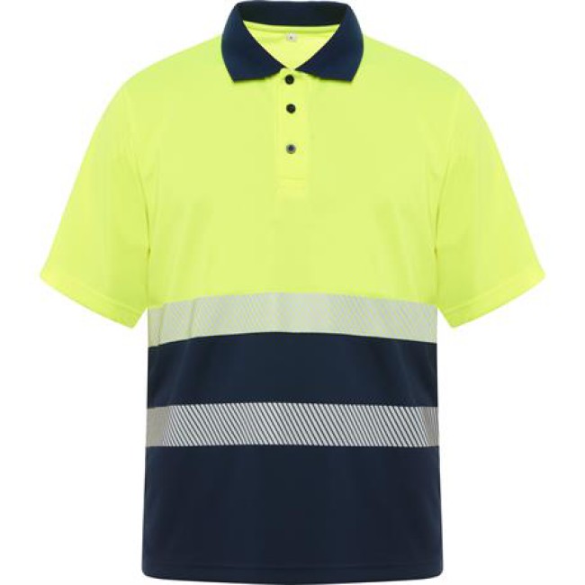 Polo tecnica ad alta visibilità a maniche corte.· Due bande riflettenti segmentate sul petto e sulla schiena.· Pattina con 3 bottoni a contrasto.· Colletto in maglia a coste 1x1.· Tessuto antistrappo e di facile asciugatura.· Tasca opzionale.