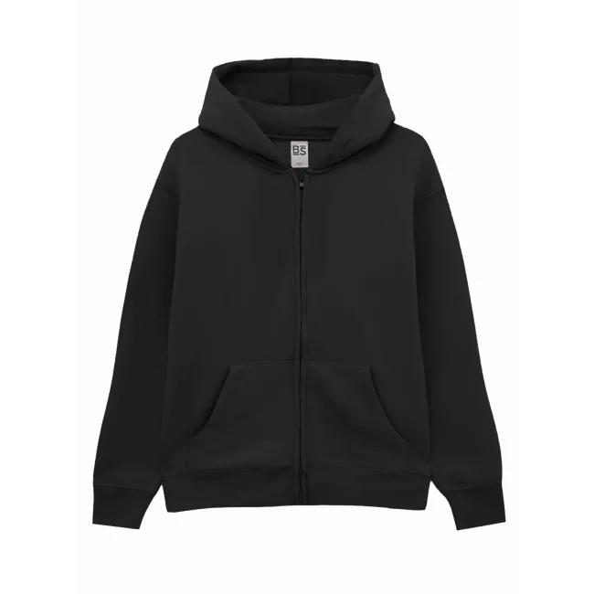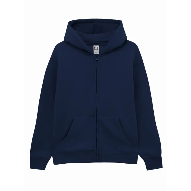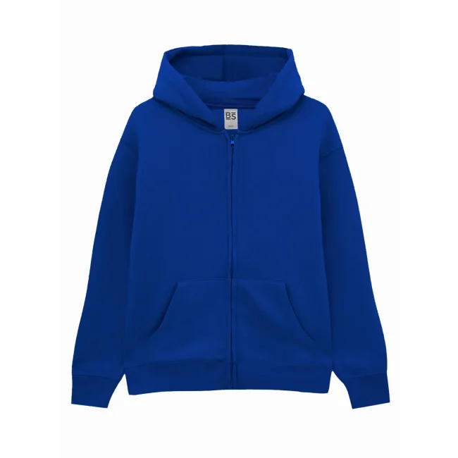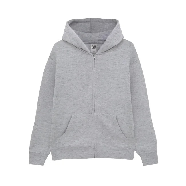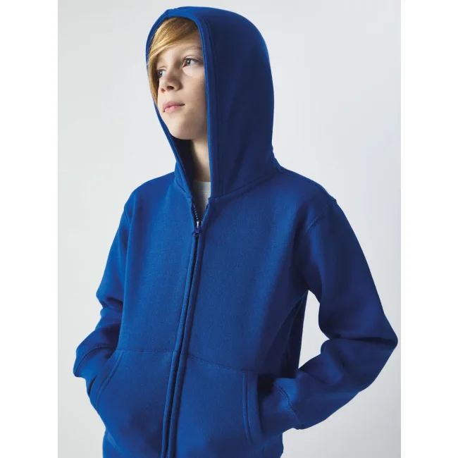70% cotone, 30% poliestere. Felpa da bambino, con cappuccio a doppio strato, felpata internamente, maniche set-in, con cerniera tono su tono coperta, tasca a marsupio, orlo inferiore e polsini in costina, struttura con cuciture laterali. Etichetta strappabile. Tessuto interno in poliestere ed esterno 100% cotone.