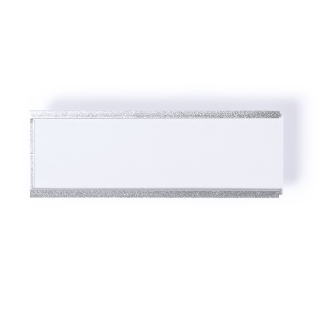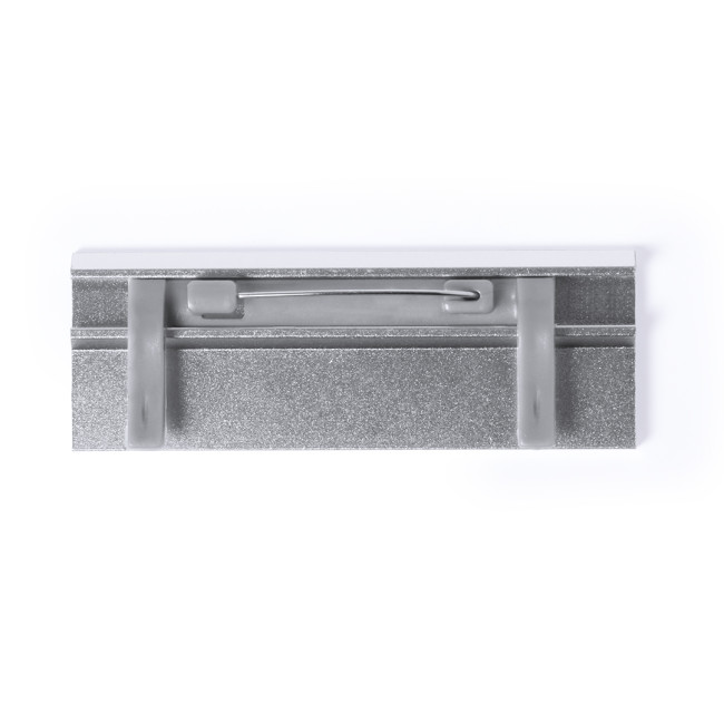 Badge portanome con cornice in alluminio con finitura anodizzata. Lato posteriore con chiusura a spillo per un fissaggio sicuro.