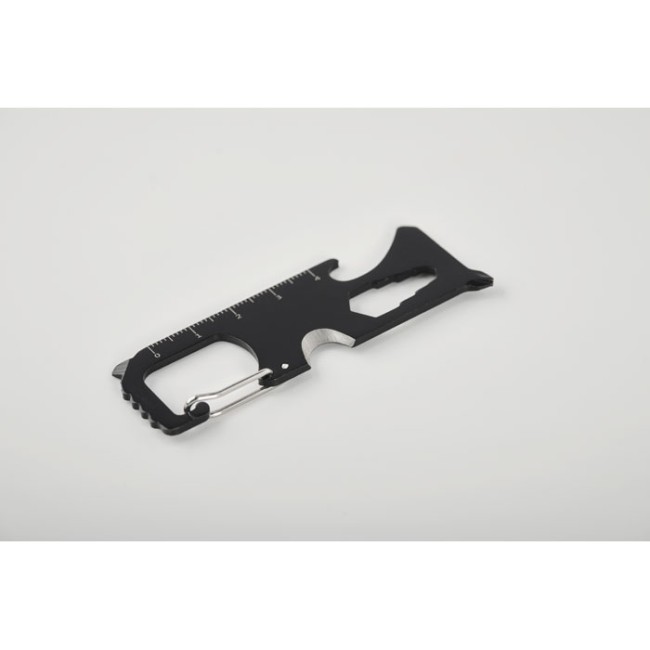 Scheda multi-tool tascabile in acciaio inossidabile. 8 funzioni: seghetto, tagliafili, chiave inglese, cacciavite Phillips, cacciavite a taglio, metro, apribottiglie e portachiavi.