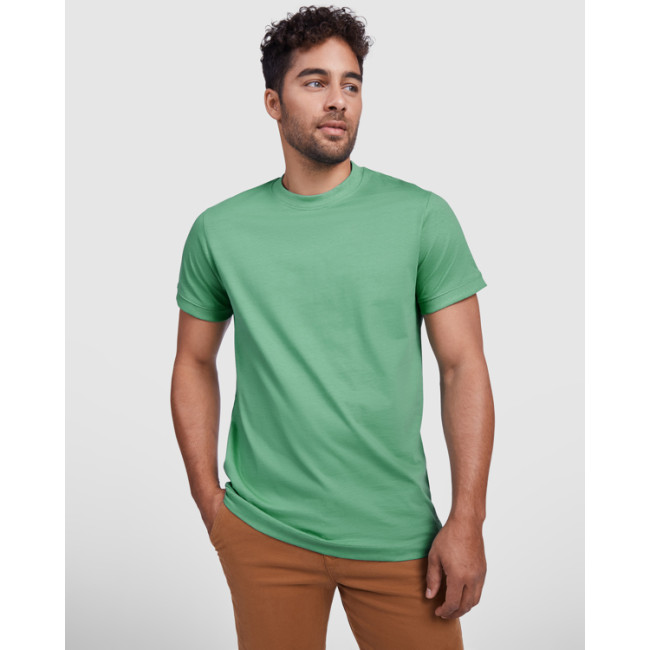 T-shirt spessa da uomo a maniche corte in cotone. Collo rotondo e polsini delle maniche a coste larghe 2x1. Copri cuciture rinforzate sul colletto. Cuciture laterali. Logo Roly sull'orlo laterale sinistro. Ampie cuciture sull'orlo.