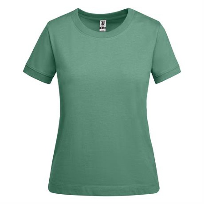 T-shirt spessa a maniche corte da donna in cotone. Collo rotondo e bordi delle maniche a coste larghe 2x1. Copri cuciture rinforzate sul colletto. Cuciture laterali. Logo Roly sull'orlo laterale sinistro. Ampie cuciture sull'orlo.