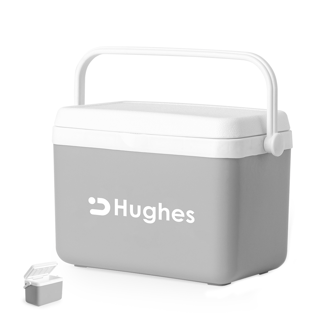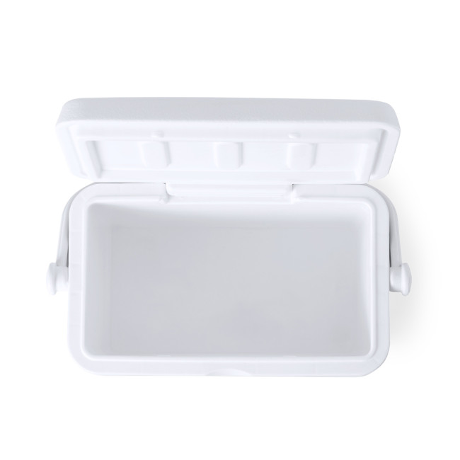Borsa termica da 4 litri in PP. Attraente design vintage per mantenere fredde bevande e cibi, design rigido a doppia parete. Coperchio incernierato con chiusura di sicurezza e maniglia rigida per un facile trasporto. Con base grigia e finiture bianche. Confezionata singolarmente in un sacchetto riciclato.