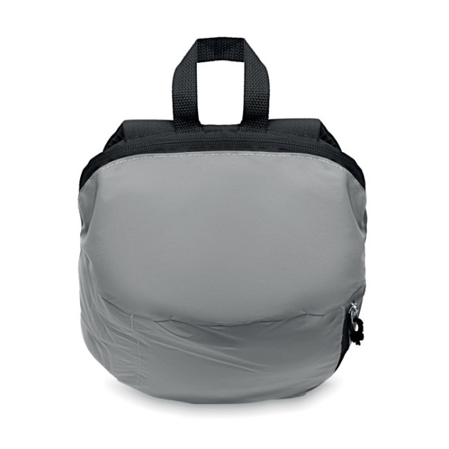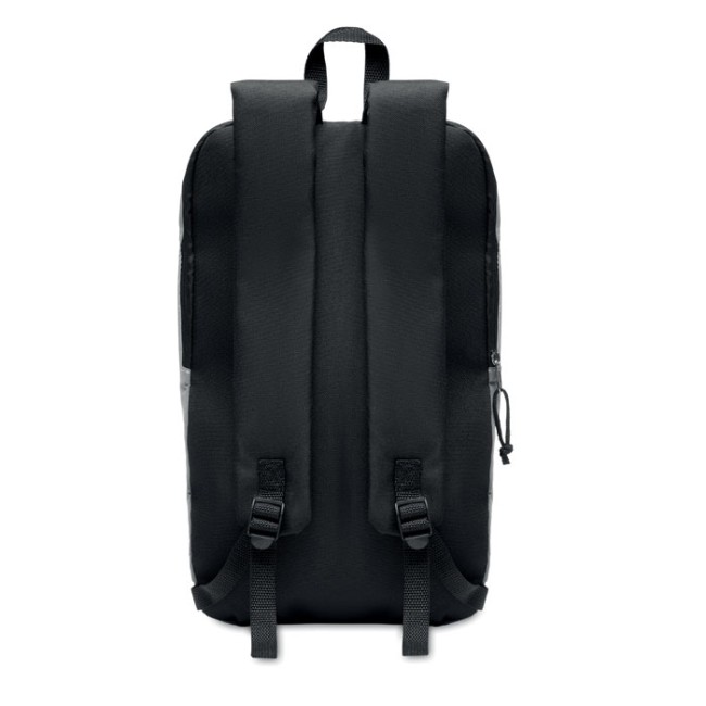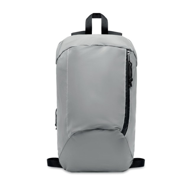 Zaino con frontale in poliestere altamente riflettente con tasca con chiusura a zip e imbottitura sulla schiena in poliesere 600D.