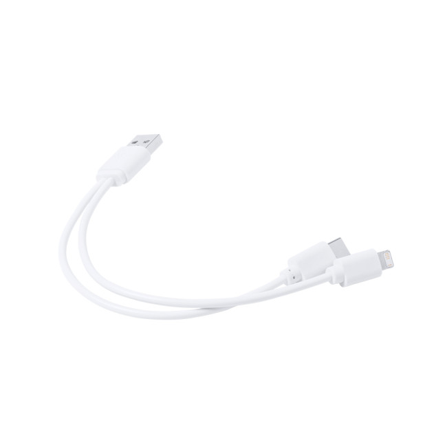 Cavo di ricarica USB con connessione Type-C e doppia micro USB/Lightning. In design bianco minimalista.