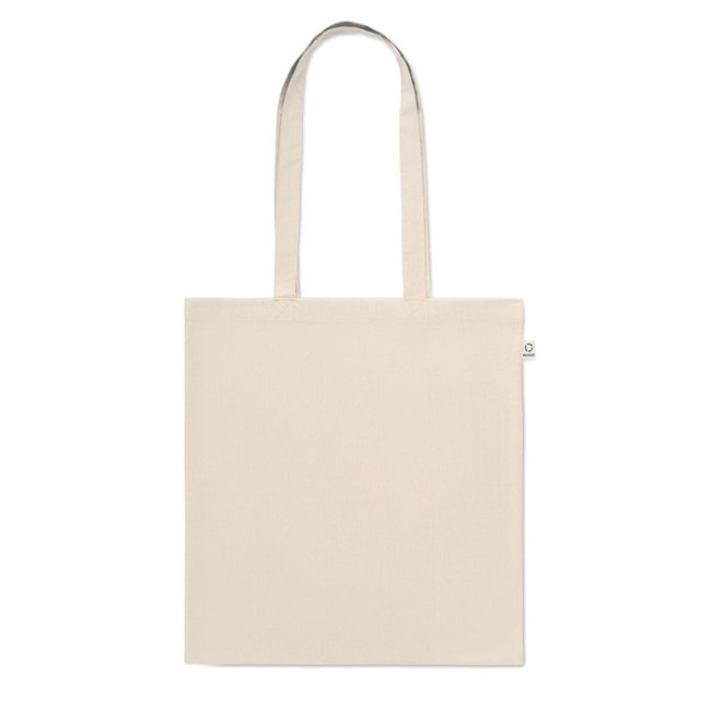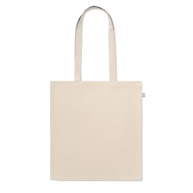 Shopping bag in cotone riciclato post-consumo (70% cotone riciclato e 30% RPET) con manici lunghi. 140 gr/m². Questo articolo può restringersi dopo la stampa.