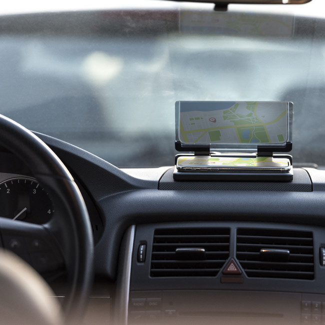 Schermo supporto da auto. Con specchio duplicatore di immagini regolabile e superficie antiscivolo ultra-aderente per cruscotto e smartphone. Presentato in una scatola dal design accattivante.