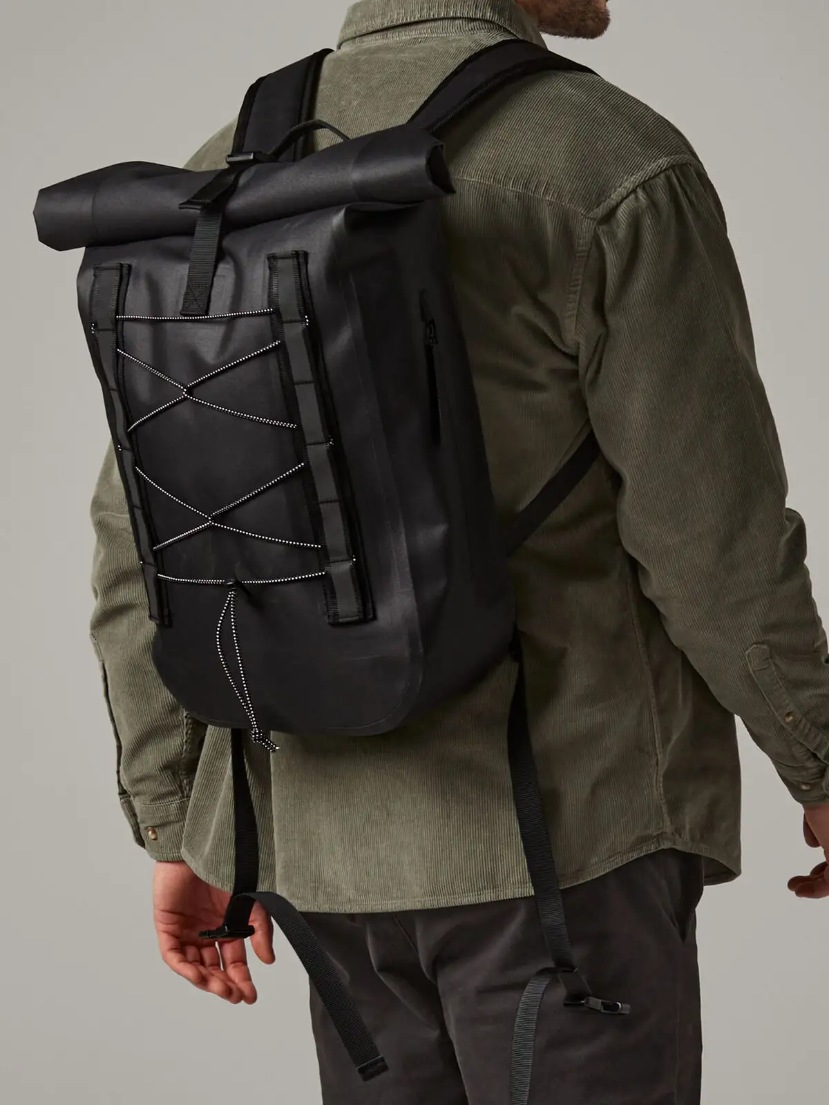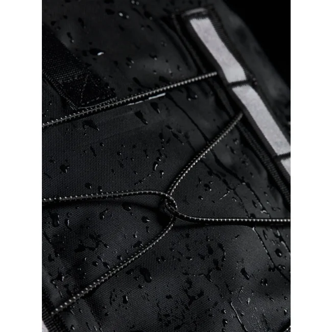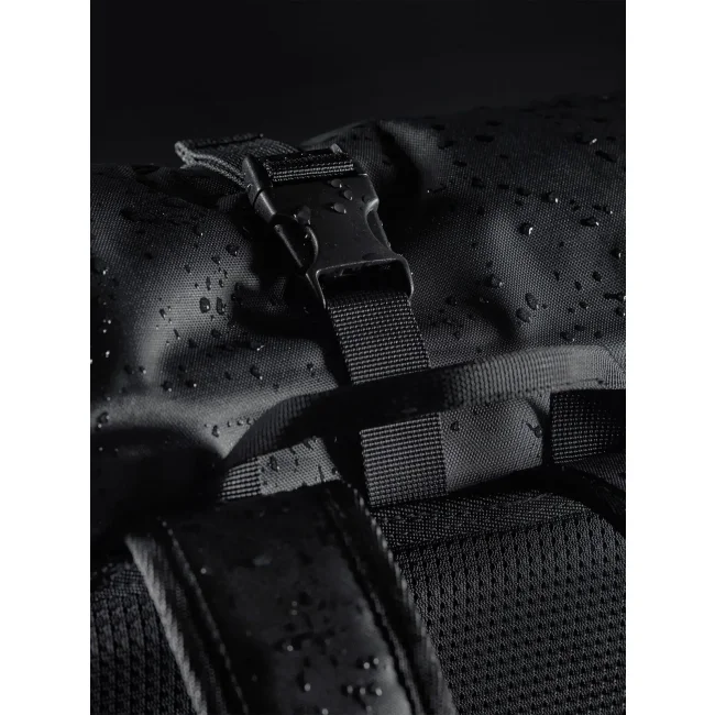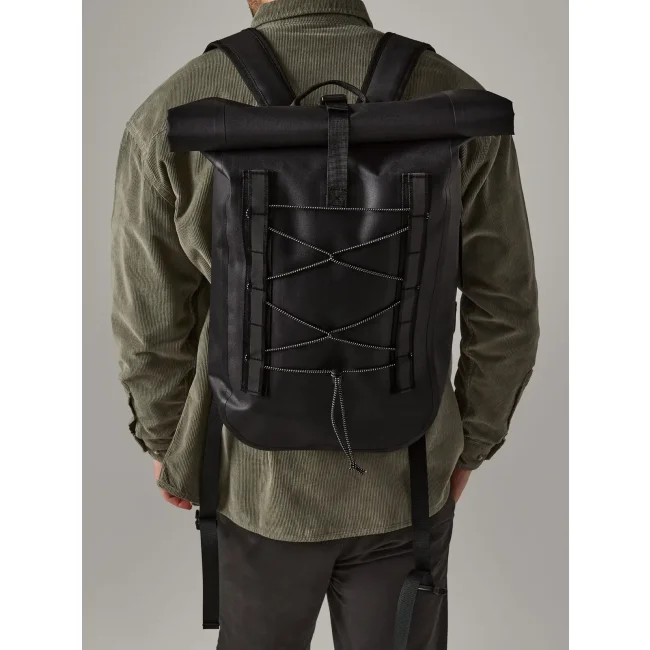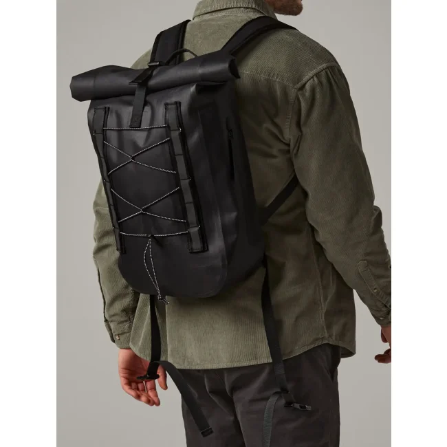 100% poliestere riciclato. Zaino con chiusura roll-top, tessuto impermeabile, cinghie in tessuto con dettagli riflettenti, scomparto principale impermeabile, inserti frontali elastici, tasca laterale con zip, spallacci imbottiti e regolabili. Dimensioni: 31x12.5x46cm, Capienza: 18 litri. Etichetta strappabile.