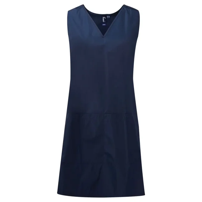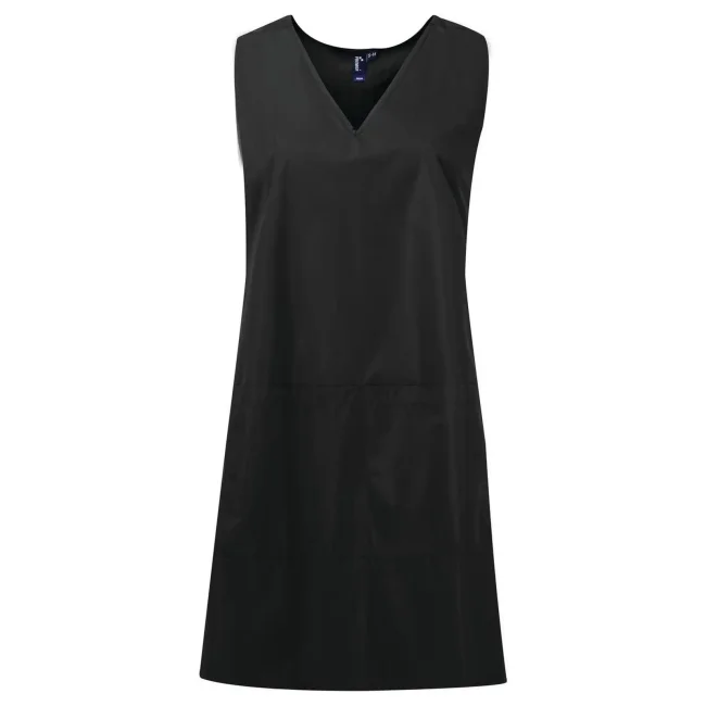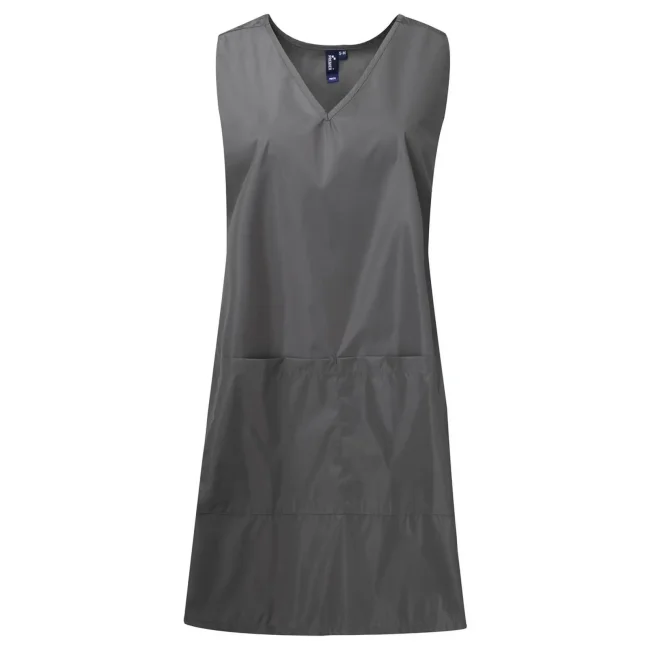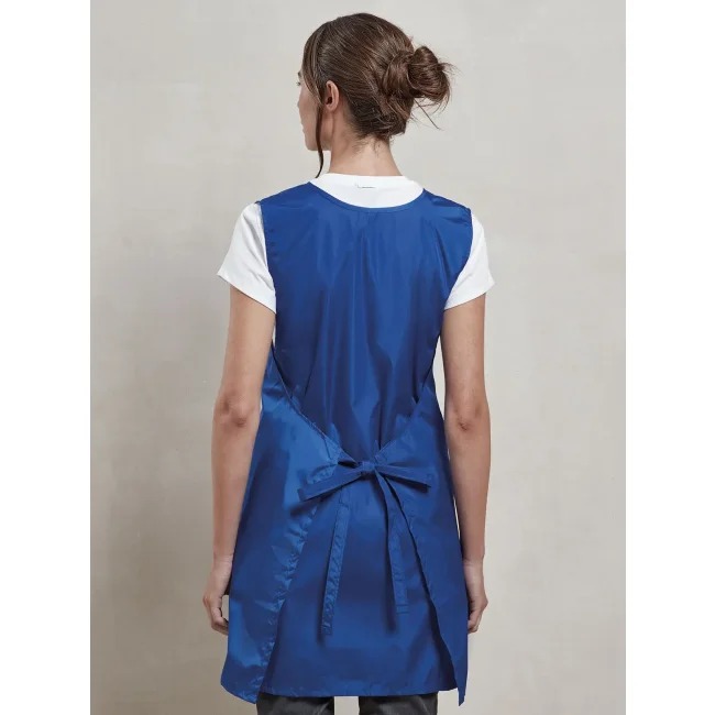 100% poliestere con rivestimento in poliuretano. Tunica con collo a V, resistente all'acqua e agli agenti decoloranti, tasca centrale doppia, taglio femminile, lunghezza 86cm.