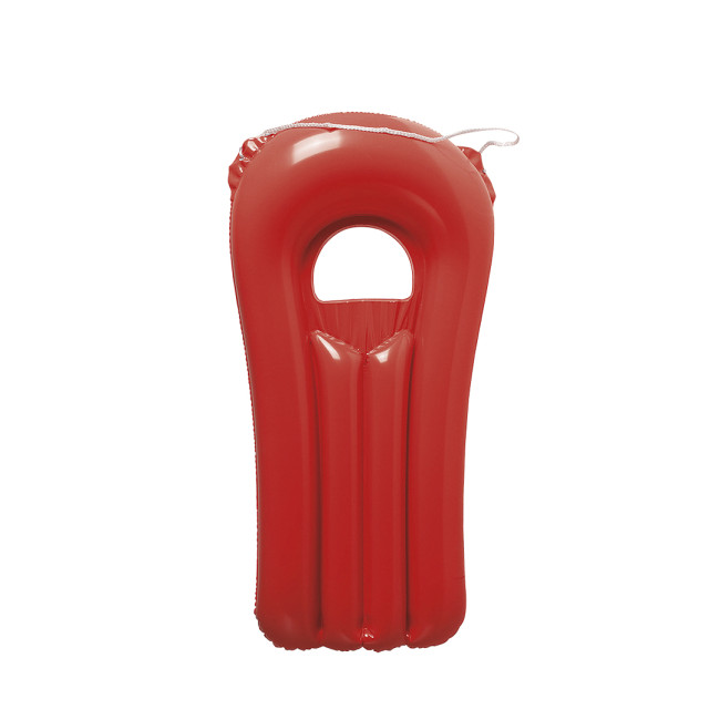 Originale materassino gonfiabile in PVC con finestra trasparente e cordino di trasporto in colori vivaci.