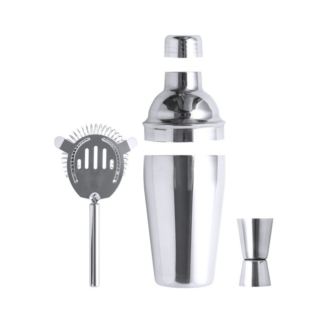 Set da cocktail con 3 accessori, in acciaio inossidabile con finitura cromata. Include: Shaker da cocktail con capacità di 550 ml, con chiusura di sicurezza e tappo dosatore sulla parte superiore.Colino con manico.Misurino singolo/doppio