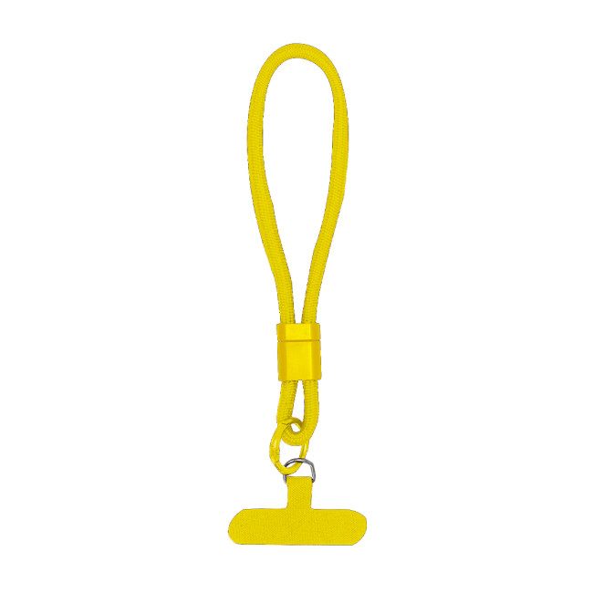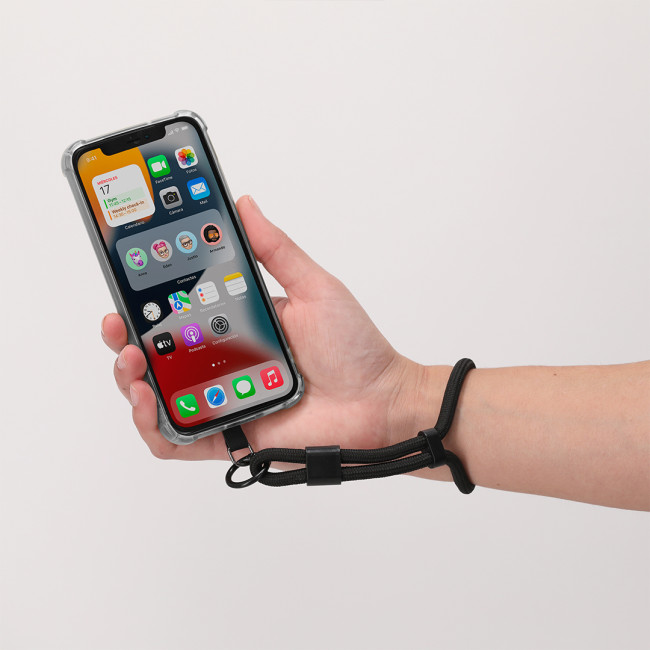 Braccialetto di supporto in poliestere morbido. Accessorio da portare tra la custodia e lo smartphone, con accessorio in plastica per la regolazione del polso.