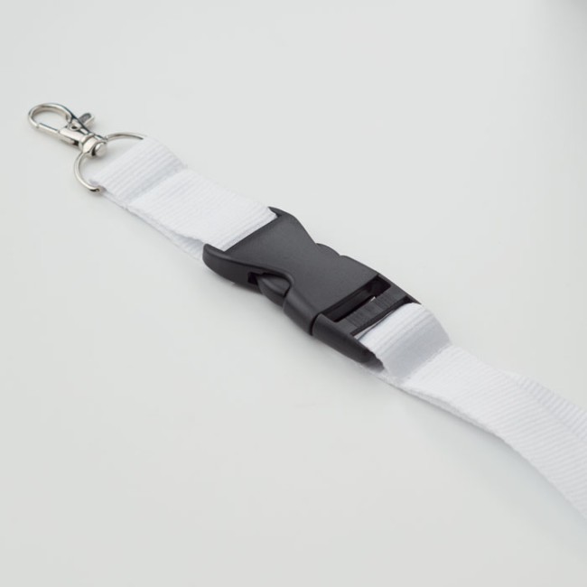Lanyard con gancio in metallo, fibbia staccabile e chiusura di sicurezza. 25 mm di larghezza. Stampa in sublimazione disponibile sono sull’articolo di colore bianco.