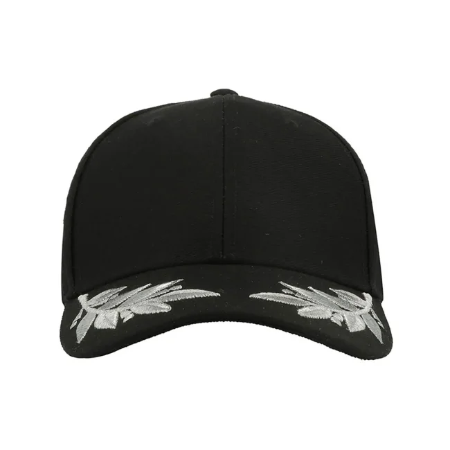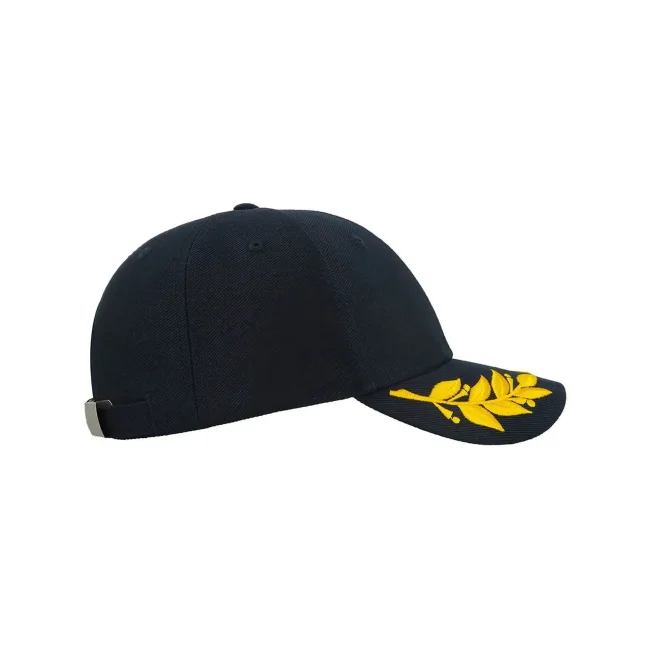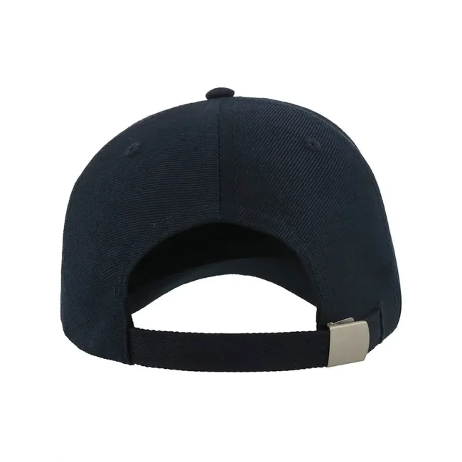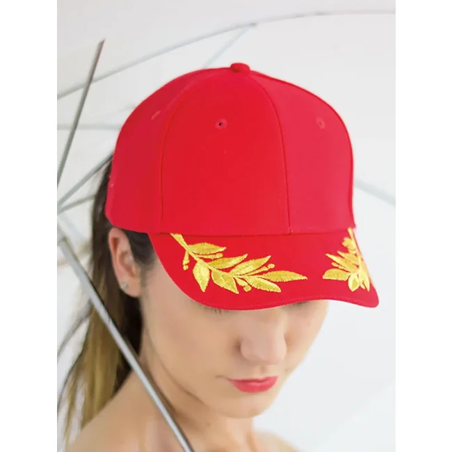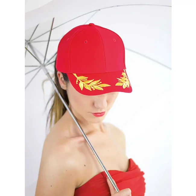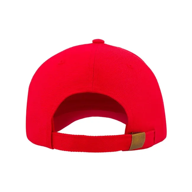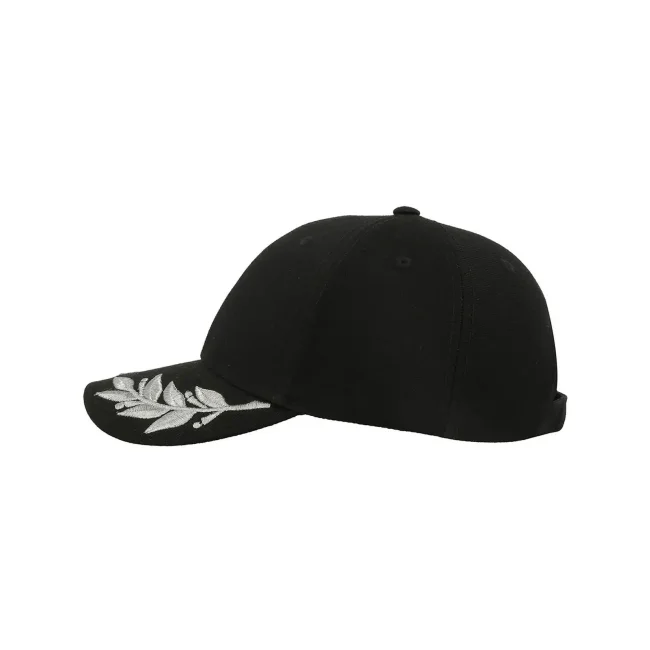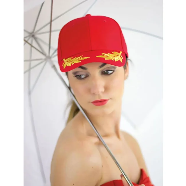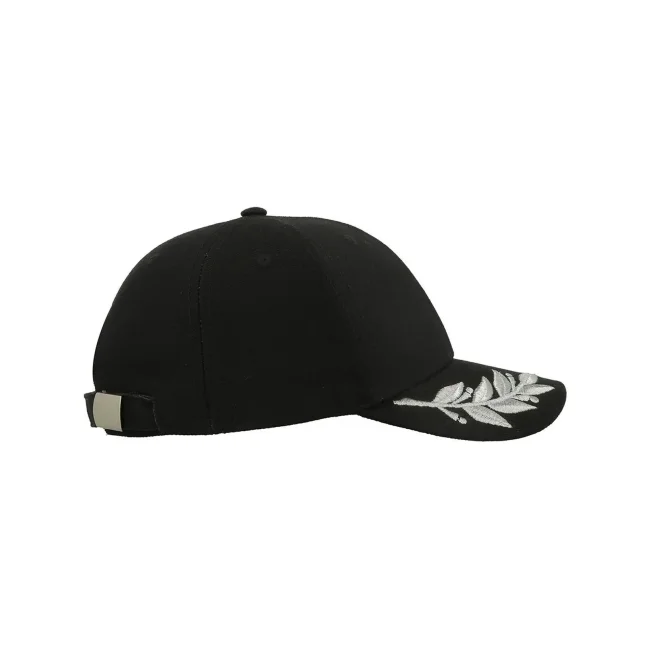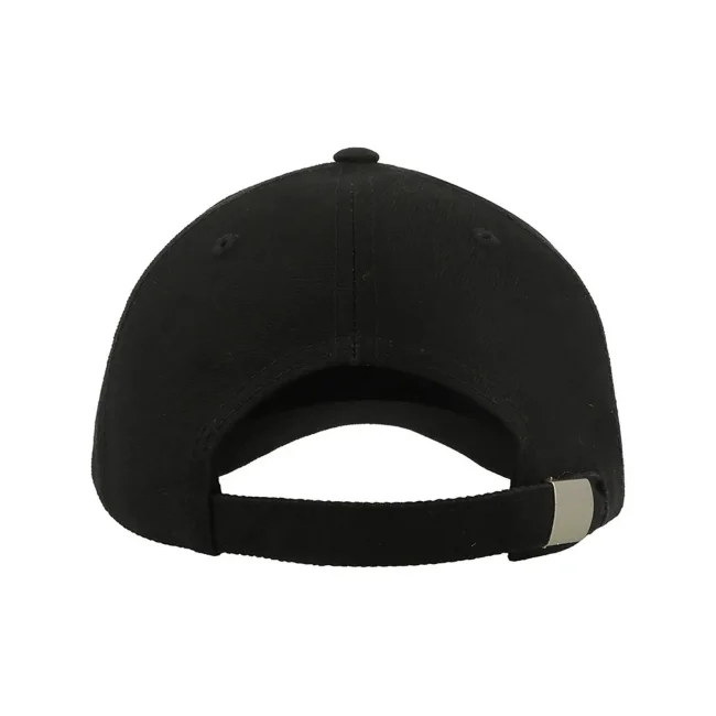 100% cotone. Cappellino da baseball a 6 pannelli, visiera ricamata, chiusura con cinturino e fibbia in metallo satinato, taglia unica. Etichetta removibile.