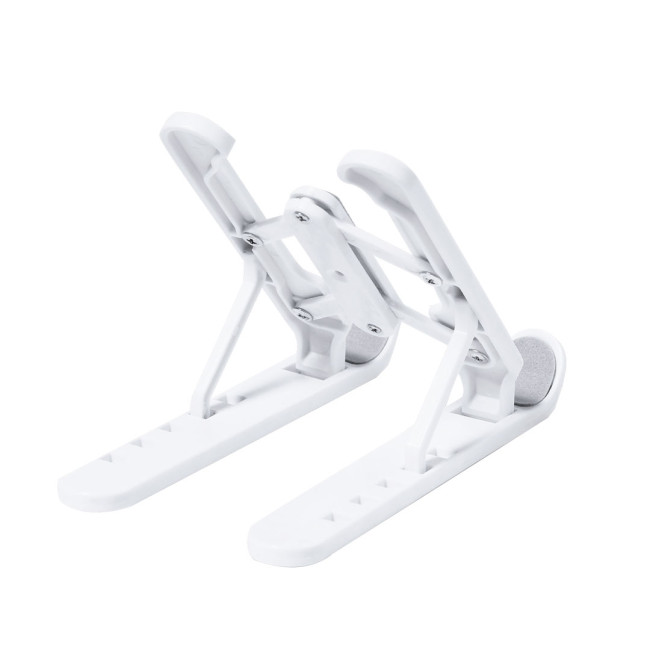 Supporto pieghevole per tablet. Realizzato in resistente ABS con protezioni antiscivolo per un solido adattamento al dispositivo di colore grigio. Regolabile in altezza su 5 posizioni e compatto da chiuso.