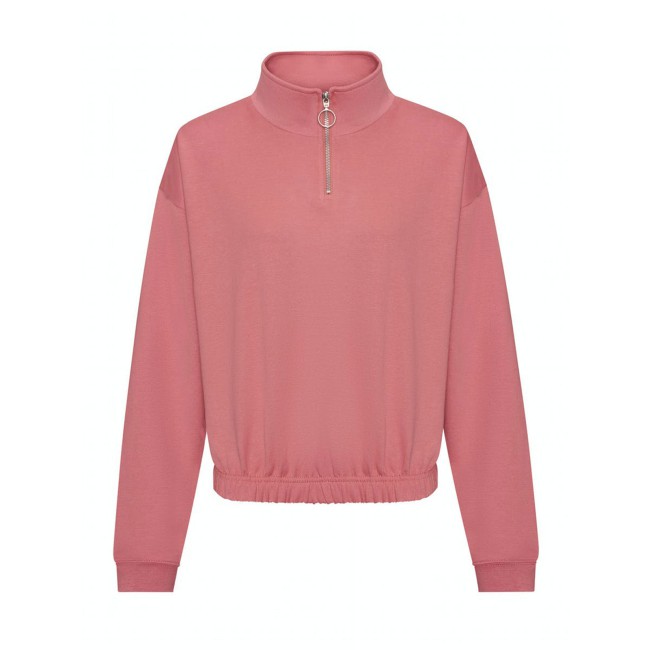 80% cotone 20% poliestere. Felpa corta zip ¼, felpata internamente, taglio femminile. Collo alto, orlo elastico, polsini a costine. Tessuto morbido sul davanti per una superficie di stampa ideale. Etichetta tear-away ideale per il rebranding.