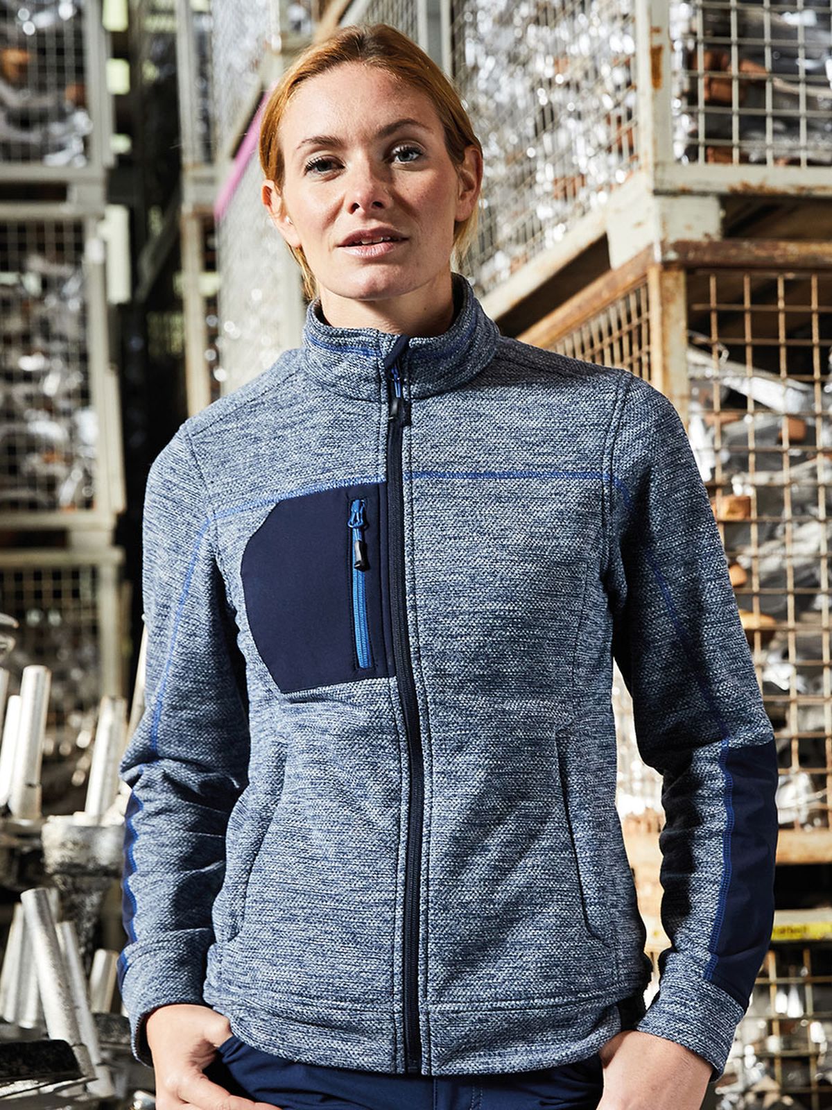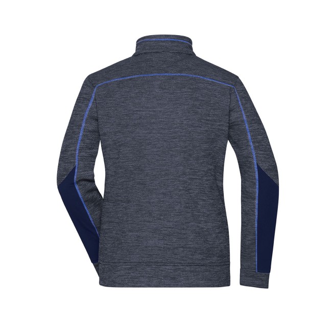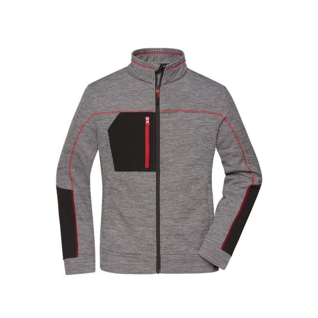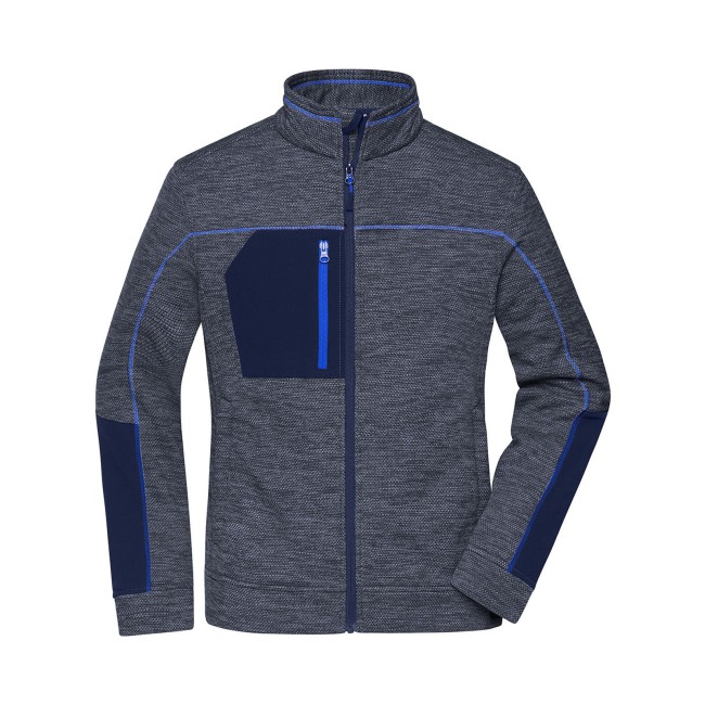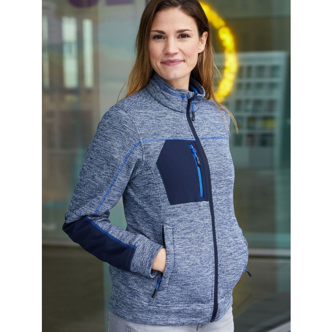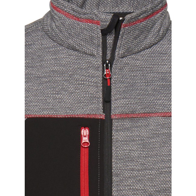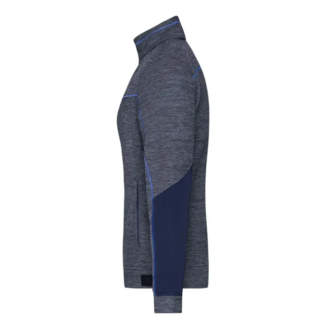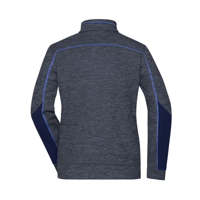 80% poliestere riciclato, 20% poliestere. Giacca in pile mélange easy-care, interno felpato, 2 tasche laterali con zip, 2 tasche interne, petto con zip e cuciture a contrasto, coletto alto, zip frontale con protezione per mento, zip YKK, leggermente sciancrata.