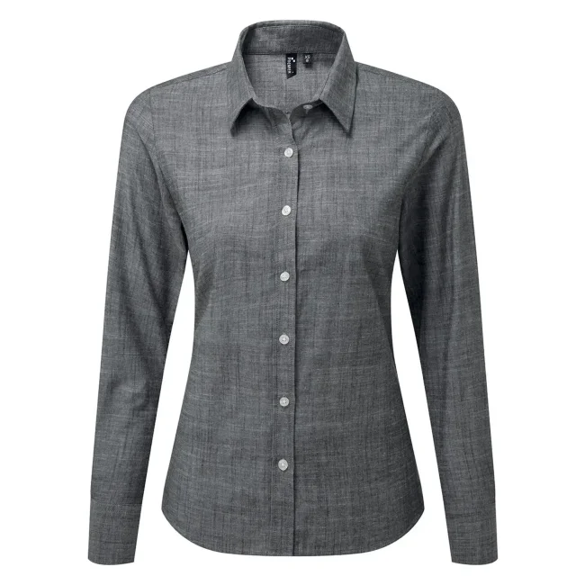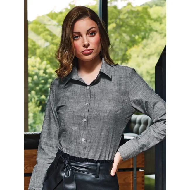 100% cotone slub Chambray. Camicia effetto filato a fiamme, colletto morbido con chiusura a bottone, pattina con 6 bottoni. Effetto filato a fiamme, polsini con due bottoni, semi-aderente con pinces sul busto e sul retro.
