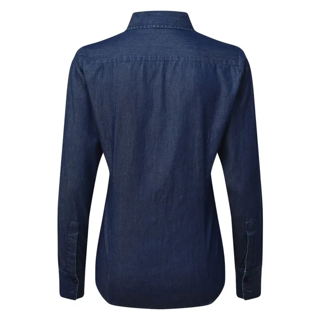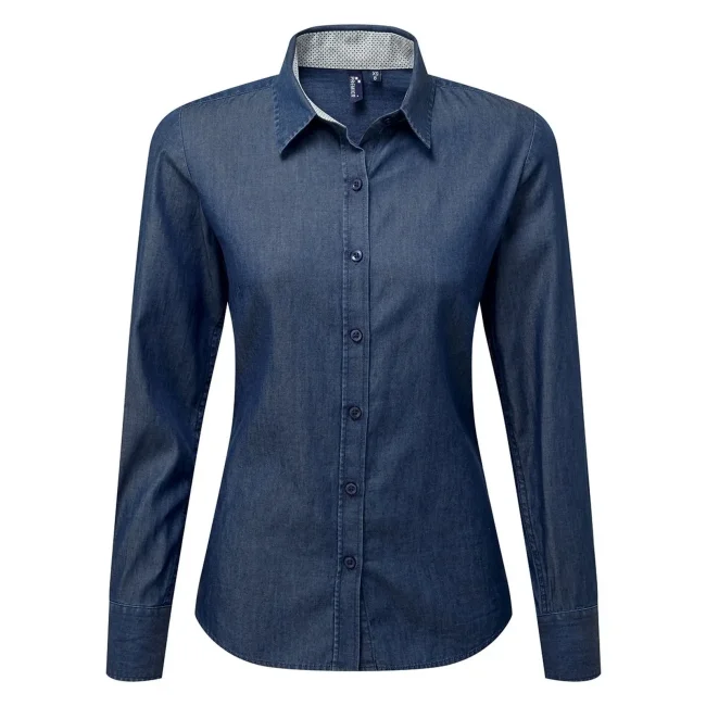 100% cotone ring spun denim. 155 g/m². Camicia semi-aderente, colletto e polsini a contrasto, pannello protettivo della manica con bottone e apposita linguetta per arrotolarla, polsini con chiusura a due bottoni, pinces sul busto e sul retro.