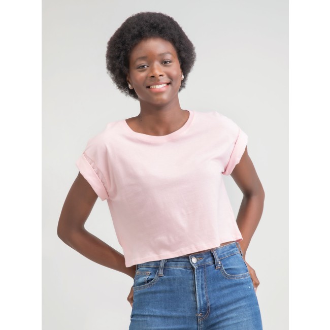 100% cotone organico. Single jersey, ring-spun. Top manica corta, set-in, colletto in costina 1x1, nastro di rinforzo alle spalle. Taglio femminile, più corto, giromaniche con orlo arrotolato. Struttura con cuciture laterali. Etichetta strappabile. Prodotto certificato GOTS.