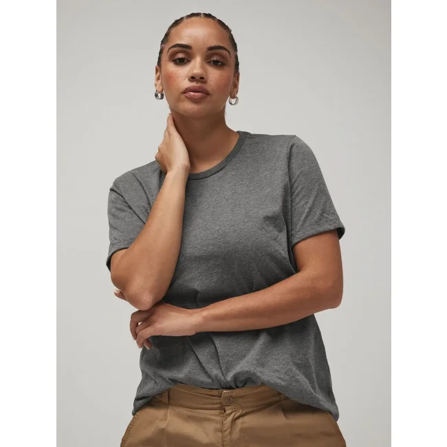 52% cotone airlume pettinato e ring-spun, 48% poliestere. T-shirt donna con vestibilità morbida, maniche corte e cuciture laterali, dai colori melange per effetto vintage. Etichetta removibile. Athletic Heather: 90% airlume cot 10% pol.
