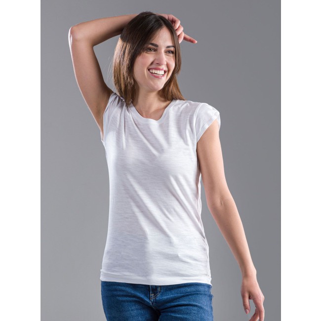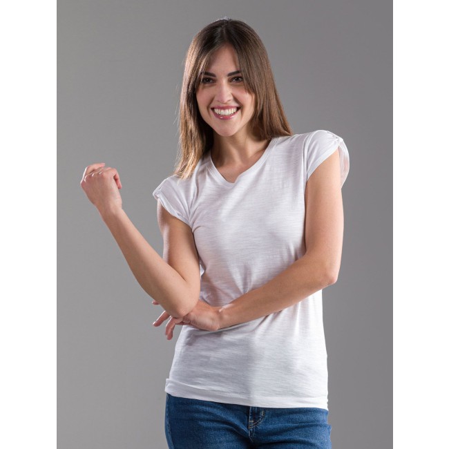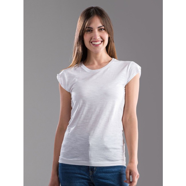100% cotone . T-shirt taglio femminile con manica corta raccolta sulla spalla, girocollo basso, tessuto slub ring-spun single jersey. Etichetta strappabile.