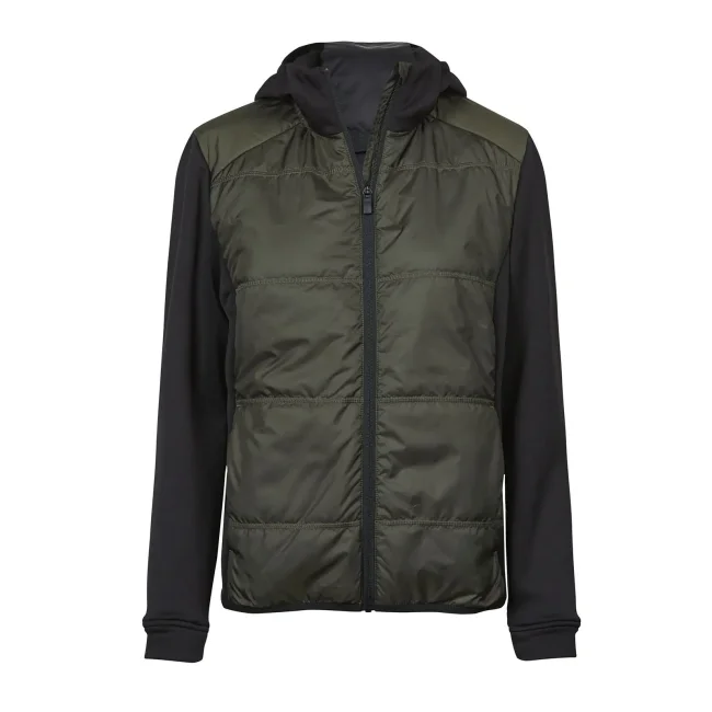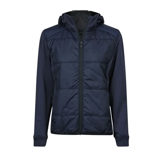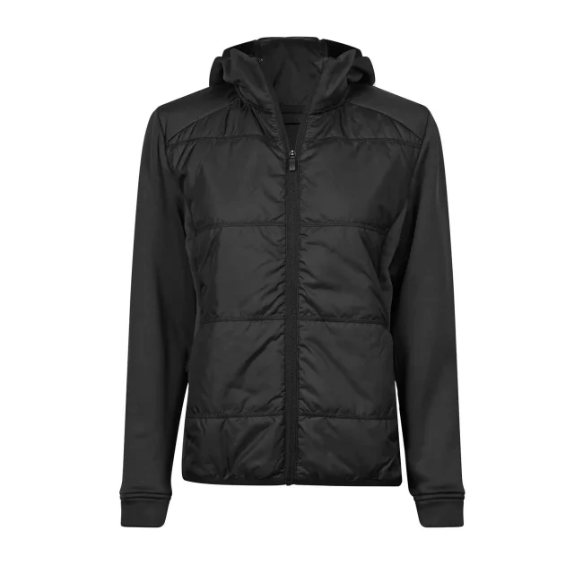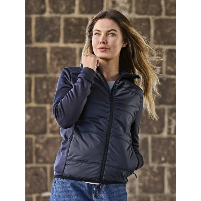 100% poliestere 300T. Fodera 380T 90% poliestere, 10% elastan, imbottitura DuPont. Questa giacca da donna con cappuccio Hybrid-Stretch è realizzata in tessuto di poliestere 300T in combinazione con pannelli e maniche in pile elasticizzato e isolata con un'imbottitura DuPont di qualità superiore sul corpo, polsini e fascia elastica sull'orlo inferiore per un look moderno, cerniere SBS di qualità, tasca interna e 2 grandi tasche anteriori nascoste.