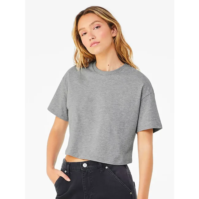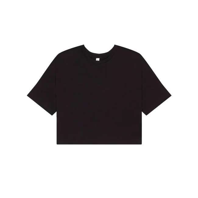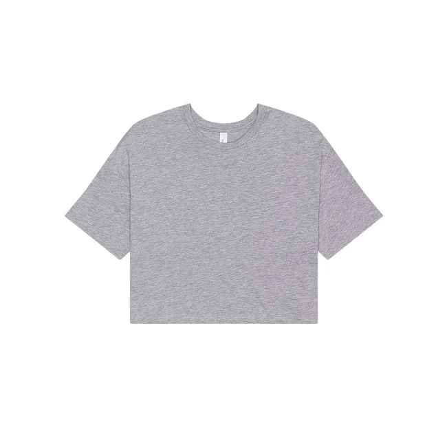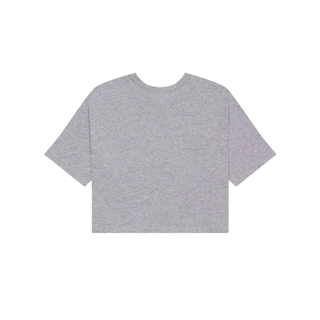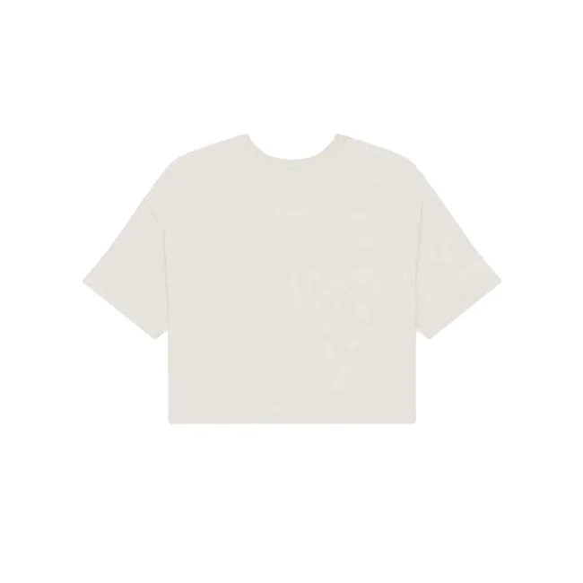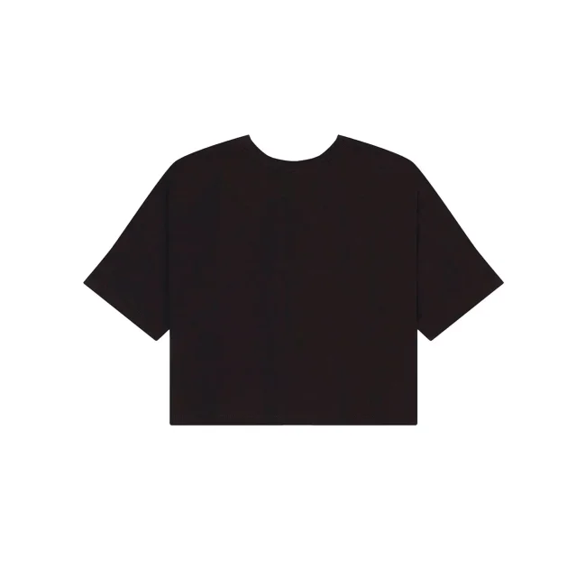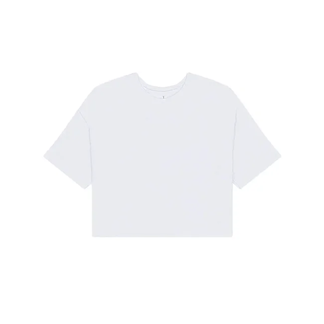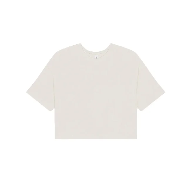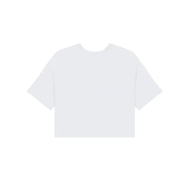 100% cotone airlume pettinato e ring-spun. T-shirt donna stile streetware, lunghezza cropped, maniche oversize, busto morbido, orlo rifinito. Etichetta removibile.