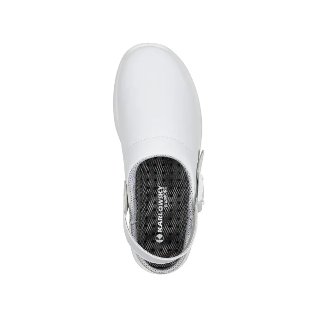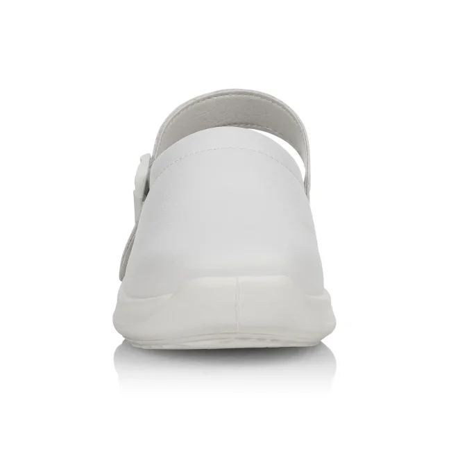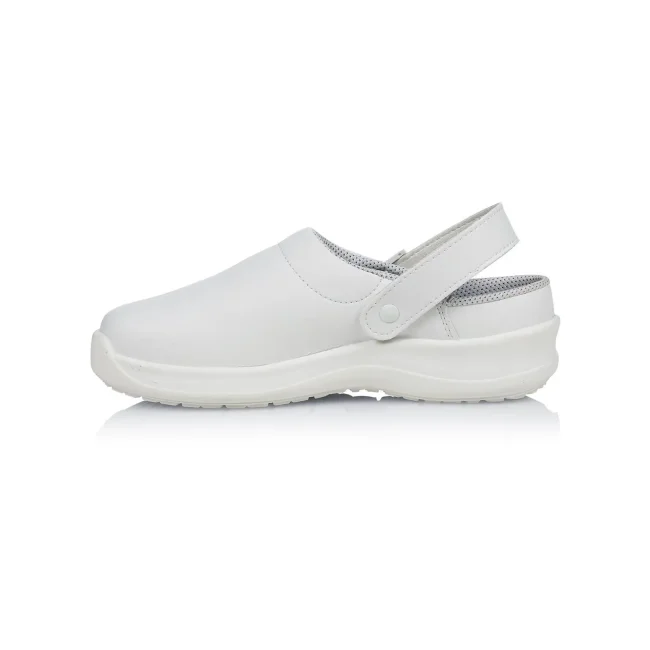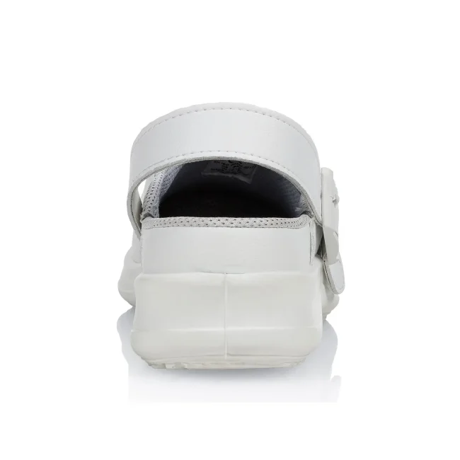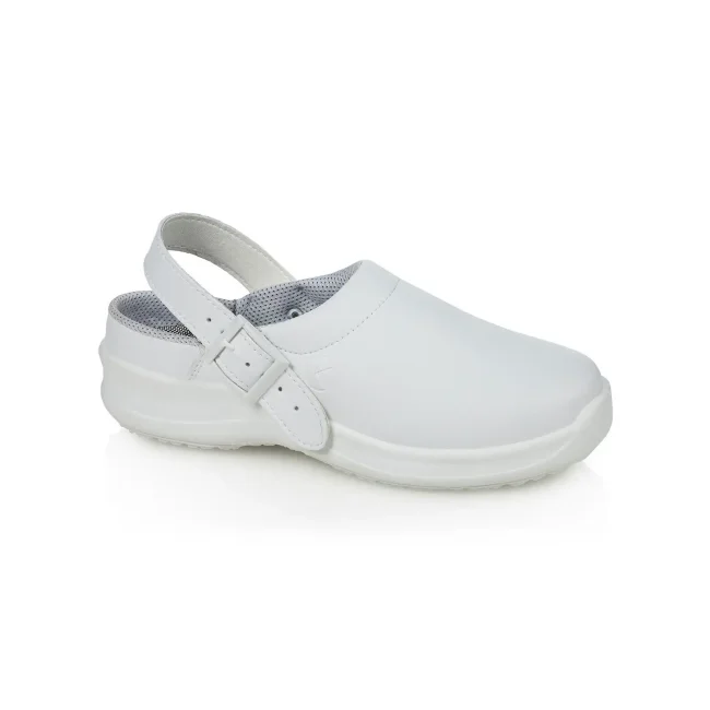 100% materiale sintetico. Scarpe unisex, senza protezione per le dita, cinturino sul retro, morbide e robuste, traspiranti, soletta PE, antiscivolo, lavaggio fino a 40°C. EN ISO 20347:2012, OB-A-E-FO-SRC.