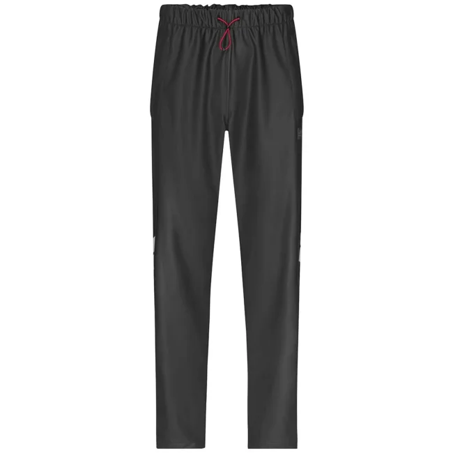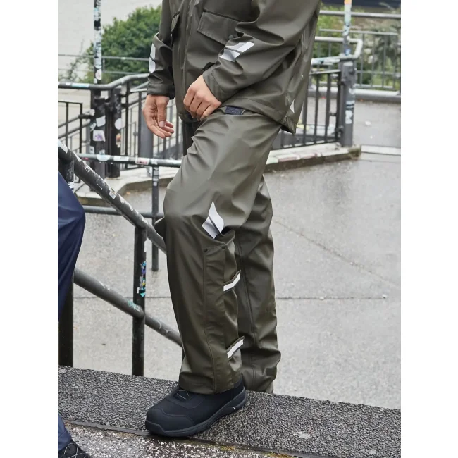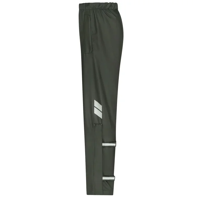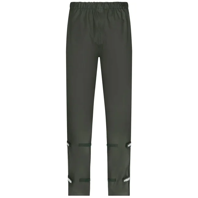 60% poliestere 40% poliuretano. Pantaloni vestibilità unisex antipioggia e antivento (10,000 mm colonna d'acqua). Cuciture nastrate, cintura elasticizzata regolabile con cordino, aperture laterali per accedere agli indumenti indossati, zip nascoste sui lati per indossare i pantaloni senza togliere le scarpe, orli regolabili con velcro. Elementi riflettenti (senza funzione protettiva / senza DPI) sulle gambe e sugli orli.