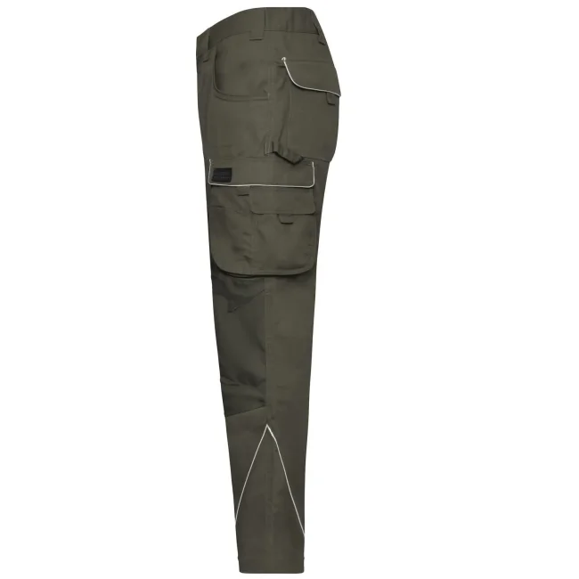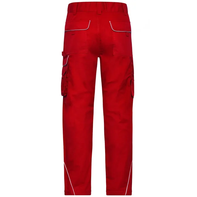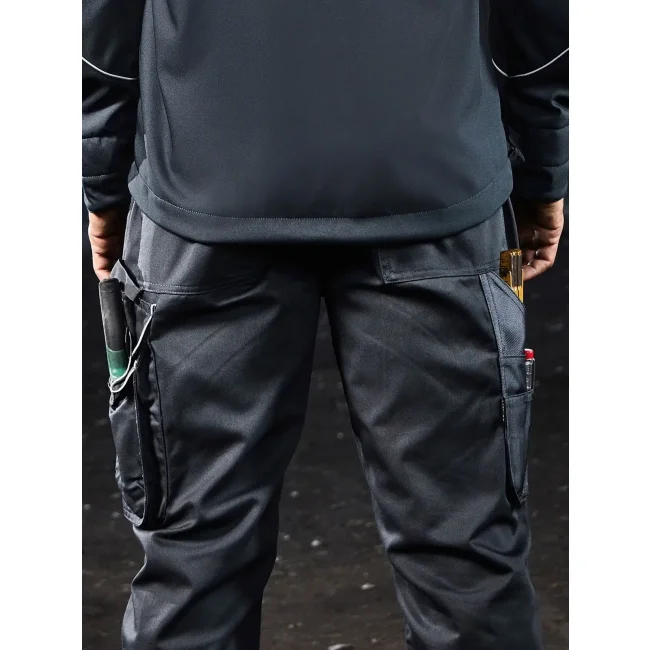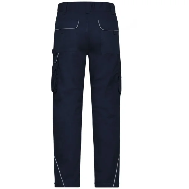 65% poliestere, 35% cotone, rifiniture 100% poliammide. Pantaloni da lavoro in tessuto misto resistente e robusto, girovita elastico con passanti per cintura, riforzo CORDURA sulle ginocchia, triple cuciture, tasche frontali, tasche porta attrezzi, due tasche con zip, taschino per cellulare, taschini porta-penna con rinforzo CORDURA, dettagli riflettenti (senza funzione protettiva / senza DPI) sulle tasche, sul davanti e sul retro, zip YKK, lavabile a 60° C e ideale per asciugatura in asciugatrice. Per evitare che il prodotto si rovini, tutti i bottoni e le zip sono nascosti.