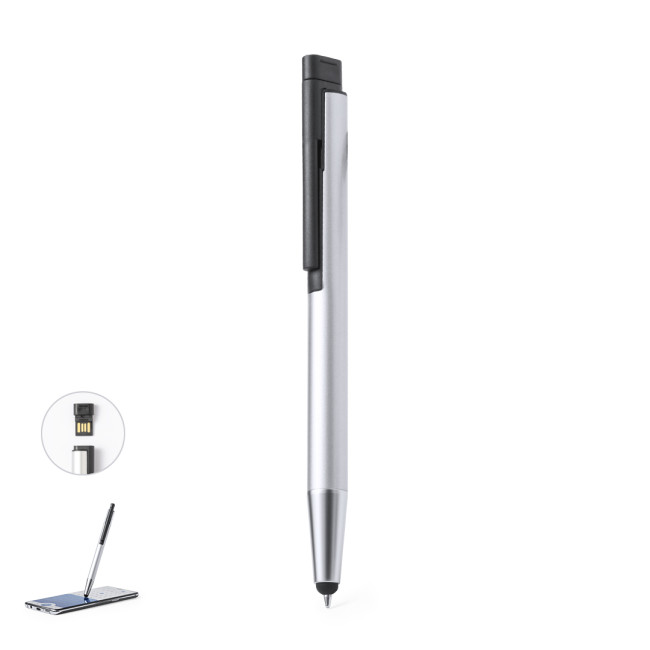 Penna puntatore USB in robusto alluminio con finitura lucida. Con chiavetta USB da 16 GB integrata nella parte superiore e clip nera. Meccanismo a pulsante, con cartuccia jumbo e inchiostro blu. Confezionata singolarmente in una scatola nera.