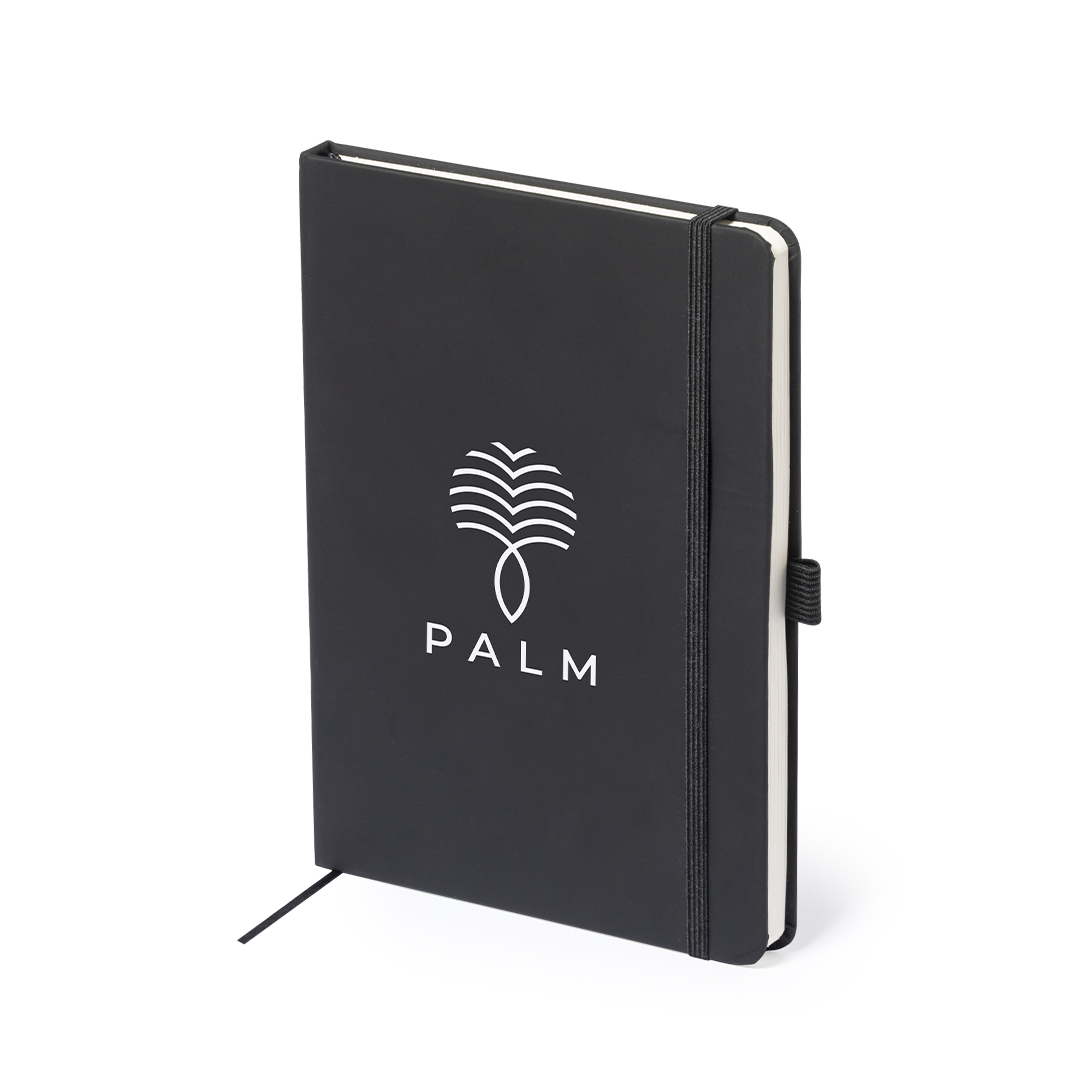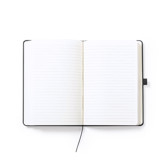 Block notes in finta pelle con elegante finitura nera. Con copertina rigida, segnalibro ed elastico coordinato. All'interno 100 fogli a riga singola e portapenne (penna non inclusa).