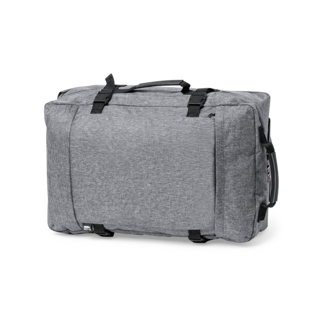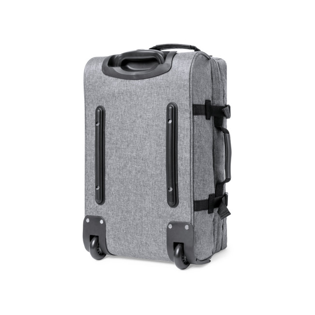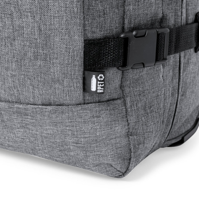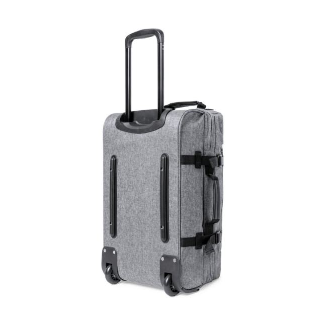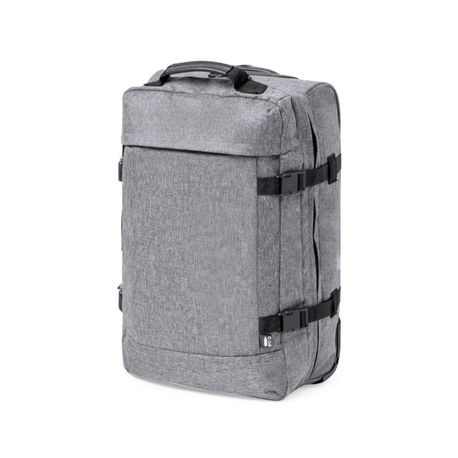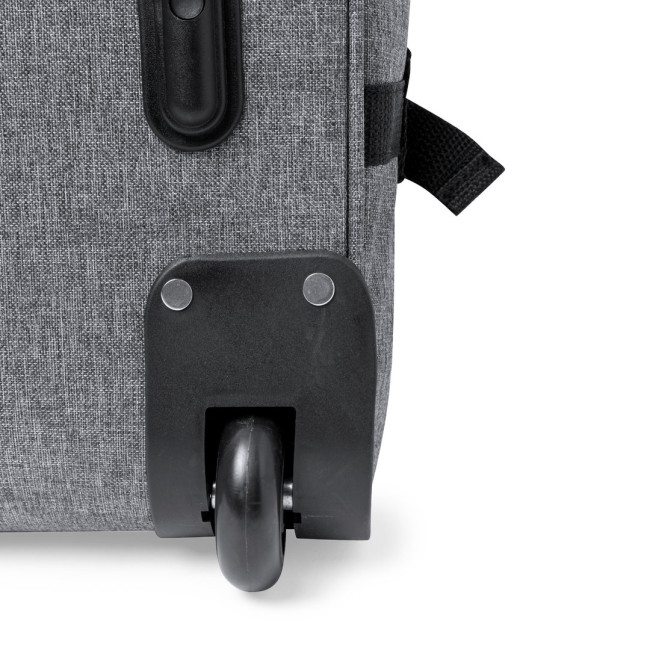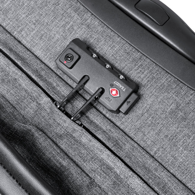 Trolley della linea natura realizzato in resistente 300D RPET. Scomparto principale con chiusura a zip a doppia trazione conforme agli standard TSA (Transportation Security Administration), che consente alle autorità doganali di ispezionare il contenuto del bagaglio senza dover forzare o rompere la chiusura, utilizzando una chiave speciale a disposizione dell'autorità. Interno foderato con cinghie di chiusura elastiche. Esterno con 2 cinghie regolabili, chiusure con fibbie, tasca frontale con chiusura a zip invisibile e 2 manici imbottiti per il trasporto. Meccanismo estraibile in metallo nero con comoda maniglia di trasporto e 2 ruote. Logo RPET sull'etichetta esterna.