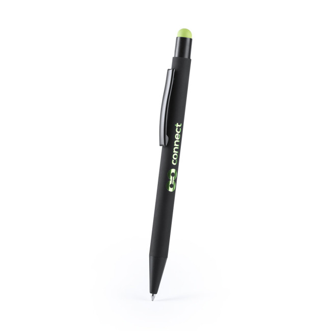 Penna stilo con meccanismo a pulsante con corpo in solida finitura nera e pulsante in una varietà di colori. Clip in metallo nero. Appositamente progettata per l'incisione laser e dotata di uno speciale rivestimento esterno che consente di incidere perfettamente la vostra pubblicità, abbinandola al colore del puntatore. Cartuccia Jumbo e inchiostro blu.