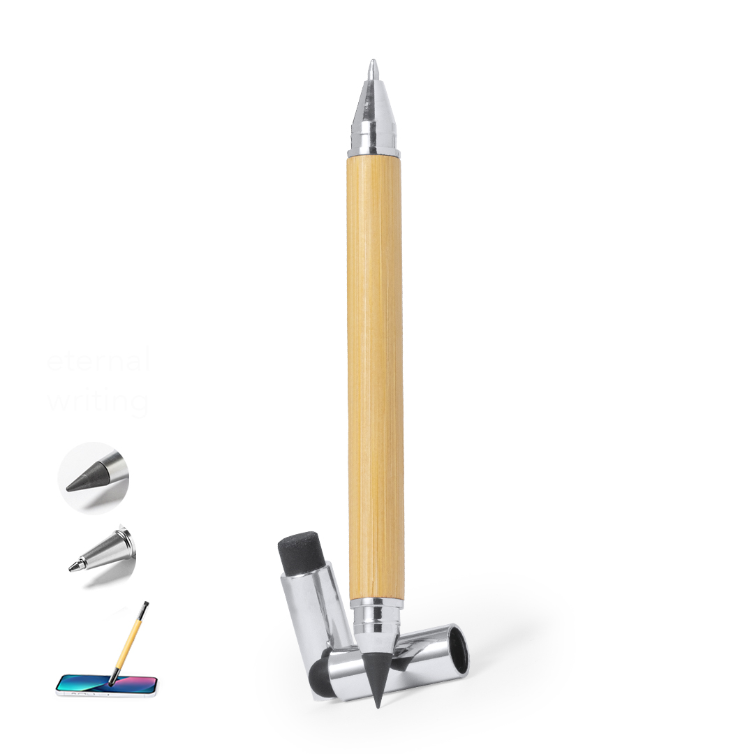 Penna 2 in 1, in bambù, con fusto liscio e finiture cromate. Chiusura a cappuccio con gomma e touch in estremità, include biro a un'estremità (carica jumbo e inchiostro blu) e matita eterna all'altra estremità, per utilizzare sempre la stessa matita e non generare sprechi. Presentata in un astuccio in cotone con chiusura a cordoncino.