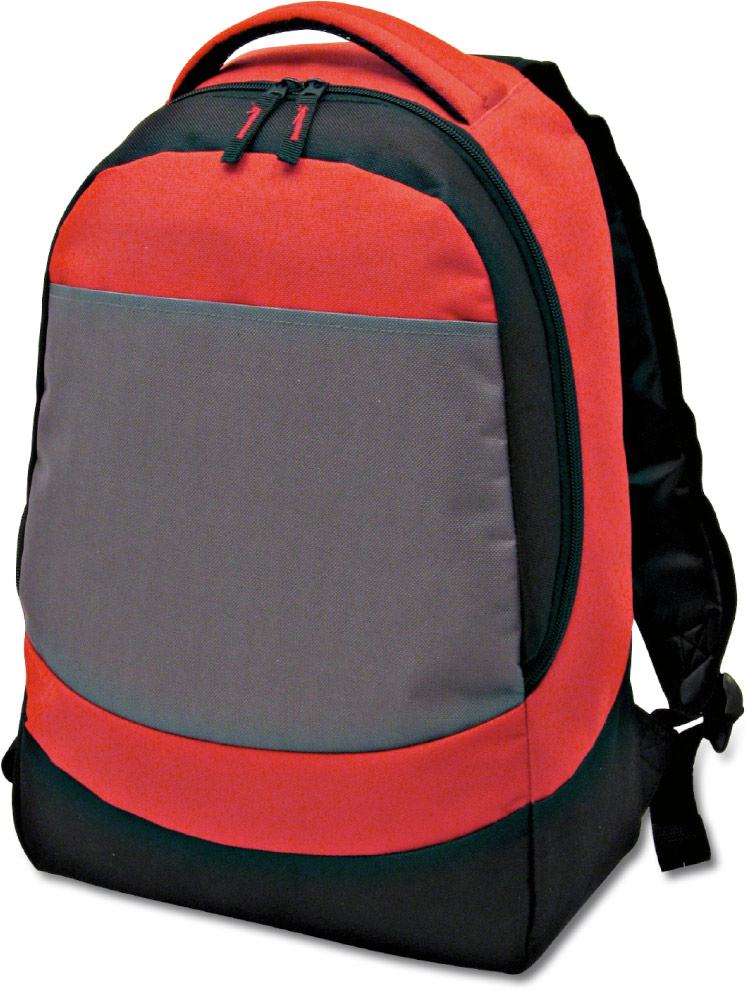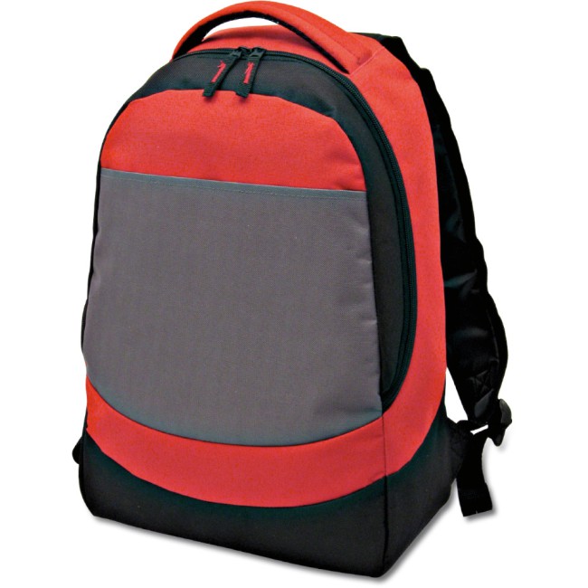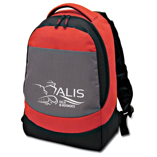Zaino in polyestere 600D colorato e rifiniture nere, ampia tasca con chiusura a zip, doppio cursore, tasca frontale aperta, schienale e spallacci imbottiti. Confezione polybag.