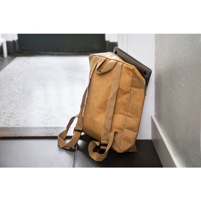 Zaino in carta laminata 310 gr/m², vano principale chiusura lampo. maniglia e spallacci regolabili, massima capacità di carico: 7 kg
