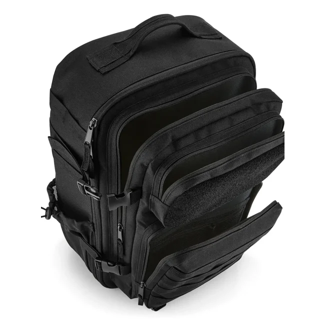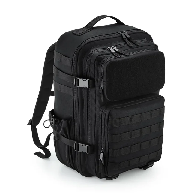 Zaino MOLLE Tactical 35L realizzato in poliestere 600D, dotato di scomparto imbottito per laptop fino a 17". Presenta tasche frontali con cerniera, tasche laterali e interne a rete. Il pannello posteriore imbottito e il cinturinopettorale regolabile garantiscono comfort durante il trasporto. Compatibile con patch Rip-Strip per personalizzazione.