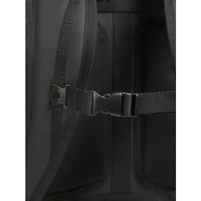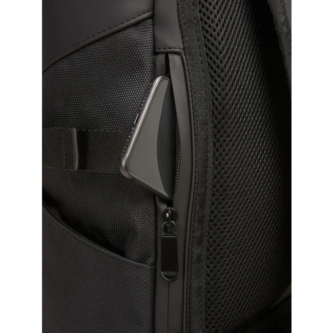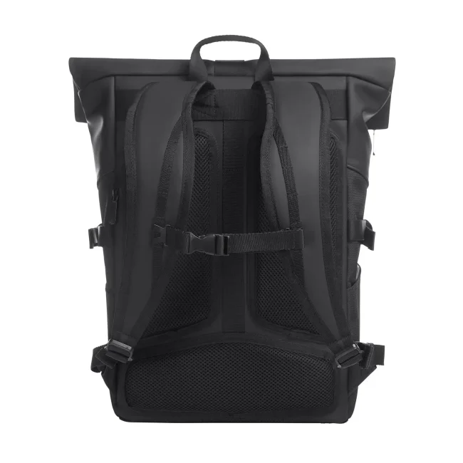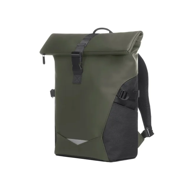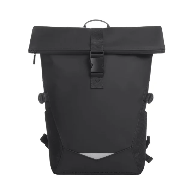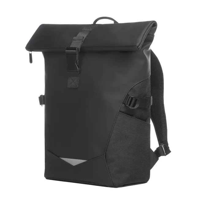 RPET soft PU. Zaino roll-top con manico, scomparto principale con zip, ampia tasca anteriore con zip, due tasche a inserto laterali, inserto riflettente decorativo frontale, tasca interna a inserto imbottita con chiusura a strappo, scomparto con zip nascosto sul retro, sistema di trasporto con elaborata imbottitura e cinturino addominale regolabile. Dimensioni: 30x44/61x16cm. Capacità: 20litri. Area di stampa: 14x11,5cm.