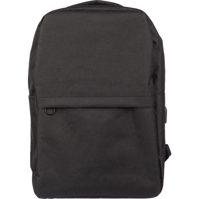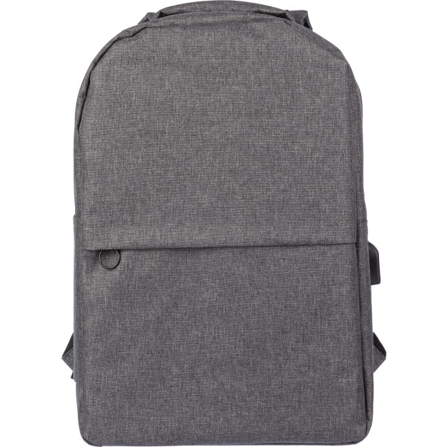 Zaino portacomputer da 15 pollici in rPET 600 D, sul lato porta USB con cavo all’interno, ampio scomparto sul lato superiore e tasca sul lato anteriore con chisusura lampo, all’interno è presente uno scomparto per dispositivi da 10 pollici e uno per dispositivi da 15 pollici, spallacci regolabili