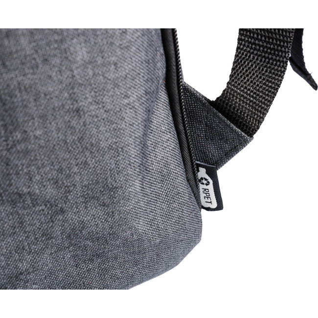 Zaino portacomputer rPET da 15 pollici in tela di poliestere 600 D, dettagli in PVC, fodera interna 210 D, dispone di una piccola tasca frontale con chiusura lampo, moschettone per le chiavi, scomparto laterale con chiusura lampo, tasca laterale, ampio scomparto con chiusura magnetica, vano per il laptop, pulsanti laterali che permettono di chiudere lo zaino quando non è completamente pieno, spallacci regolabili e ventilati, include etichetta rPET sulla parte frontale