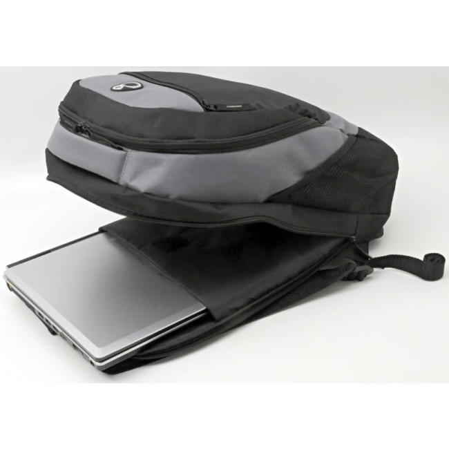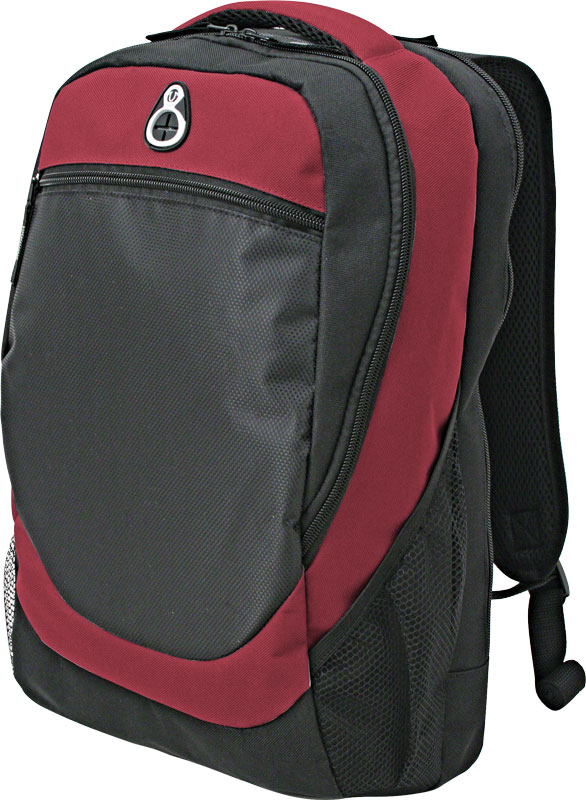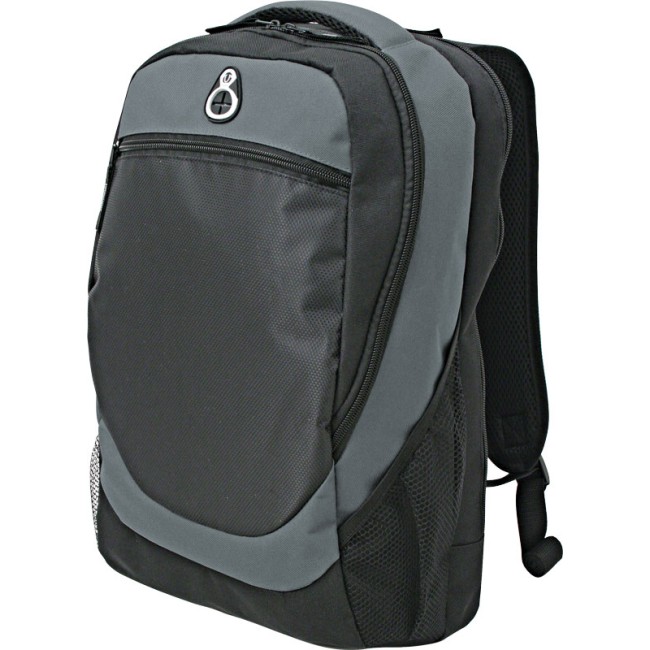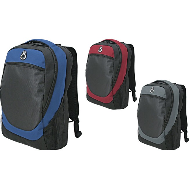 Zaino in 600D polyestere colore nero, particolari colorati, due spallacci e manico imbottiti, ampia tasca con scomparto computer, tasche e foro in gomma per uscita filo cuffie. Cerniera antifurto. Misure 30x46,5x17 cm. 23 Litri circa.