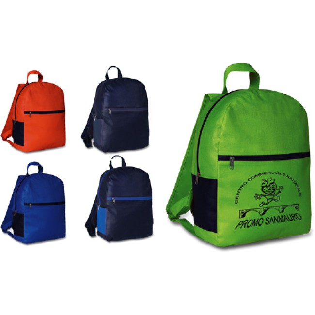 Zaino in TNT, con finiture blu navy, tasca anteriore con zip, tasche laterali a contrasto, bretelle imbottite.