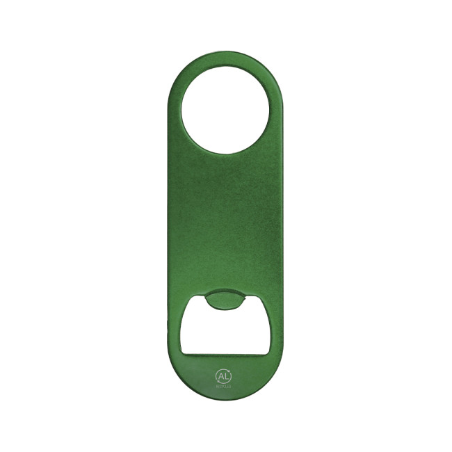 Apribottiglie in Alluminio Riciclato con finitura metallica lucida. Un’estremità con apribottiglie, l’estremità opposta con foro circolare di 3 cm di diametro. Include logo Alluminio Riciclato.